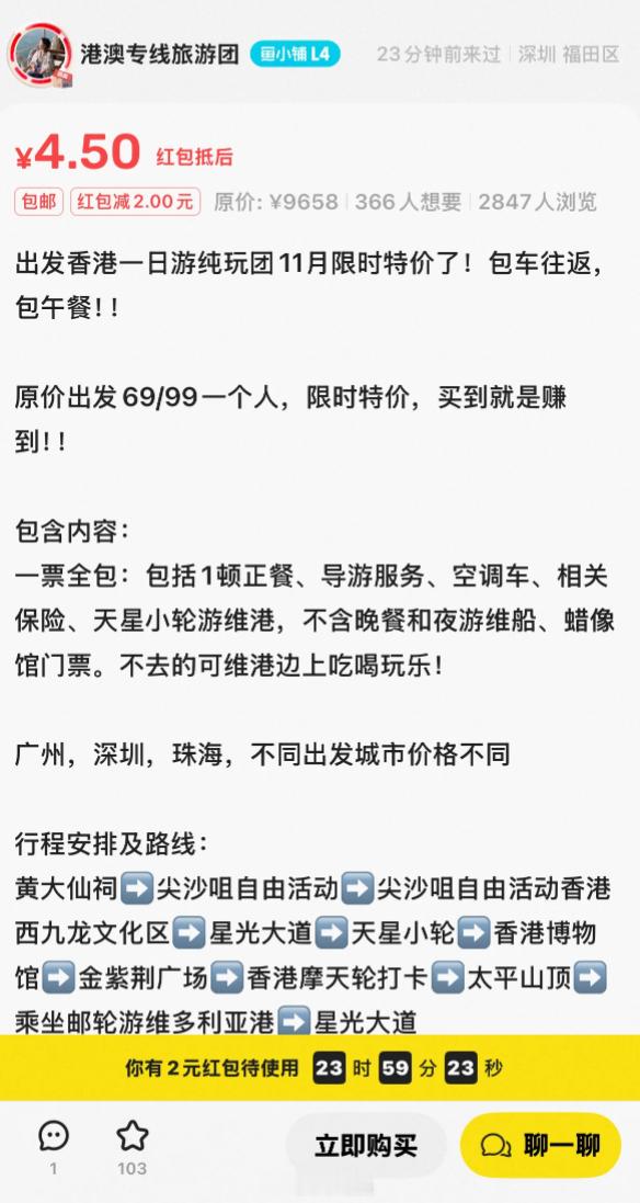 深圳到香港一日游 5.5元一个人,包车往返和包午餐。行程安排:黄大仙祠→尖沙咀自由活动→香港西九龙文化区→星光大道→天星小轮→香港博物馆→金紫荆广场→香港摩天轮打卡→太平山顶一乘坐邮轮游维多利亚港。尽管这些人知道是购物团,但是报名的人还是很多啊。。不过不强制购物。我记得以前这玩意还要几十块,现在几块钱太夸张,谁给补贴呢?深圳