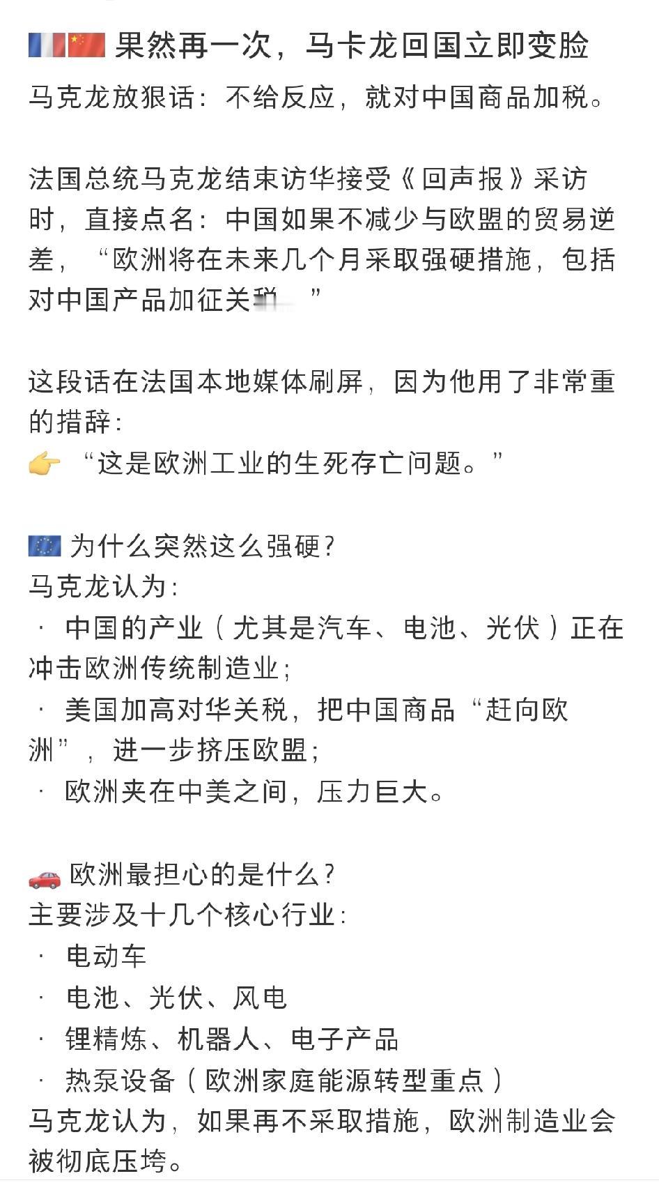 回国就变脸,马克龙你怎么了? 这么看来,马克龙这次来华,虽然情绪价值得到了很大的满足,但是实际价值有多大的收获就很难说了。 难怪之前就有人调侃:“他上次回去就做妖,这次又来做什么?”有人答曰“为了回去继续做妖”