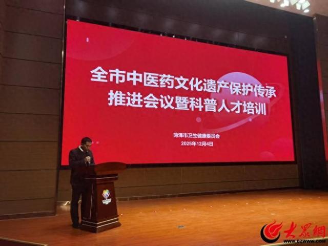 为推进中医药文化传承发展重点工作落实,加强中医药文化体系建设,强化科普人才队伍专业支撑,12月4日,菏泽市卫生健康委组织召开全市中医药文化遗产保护传承推进会议暨科普人才培训。市卫生健康委党组成员袁朝晖出席会议并讲话。