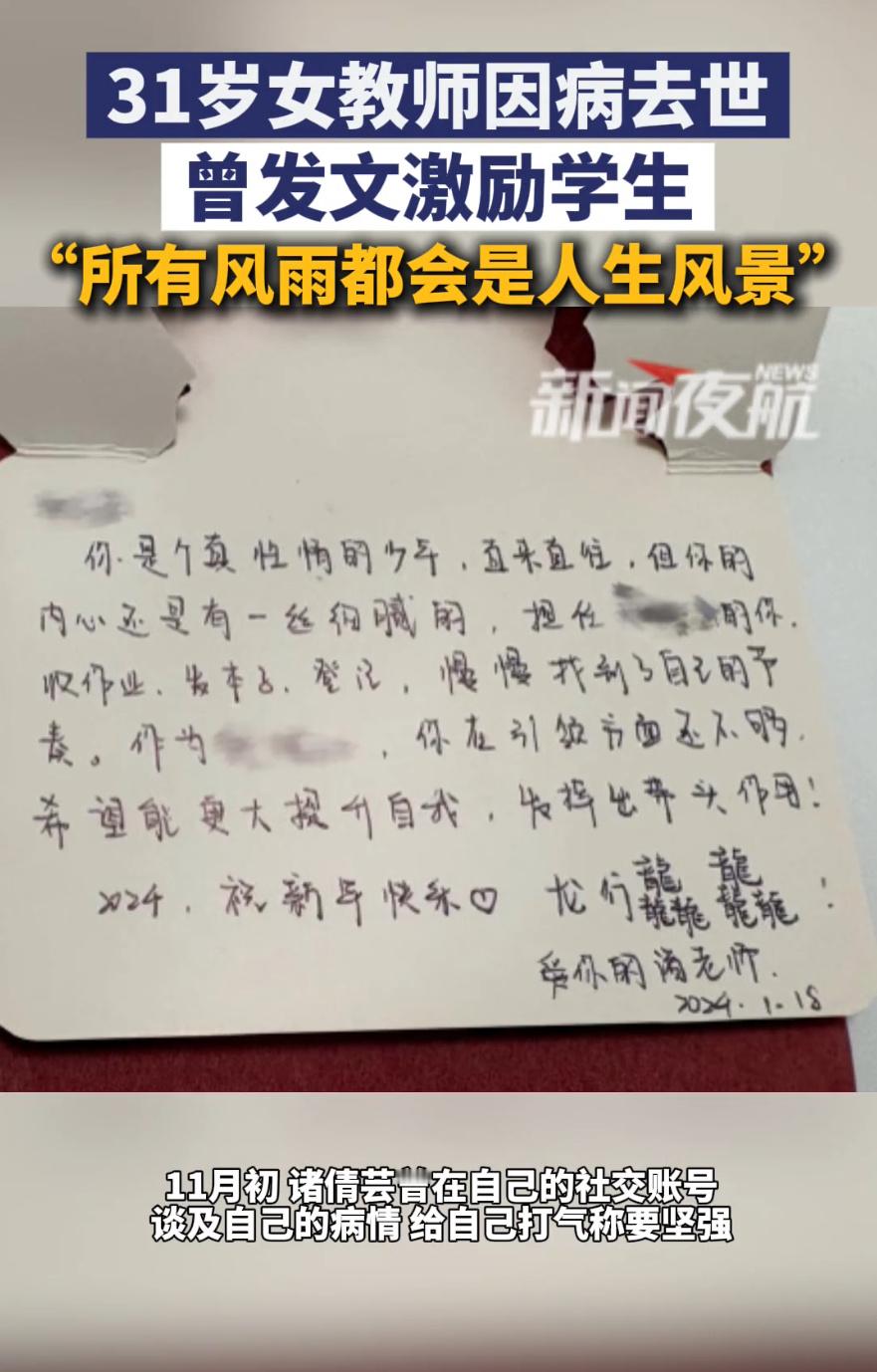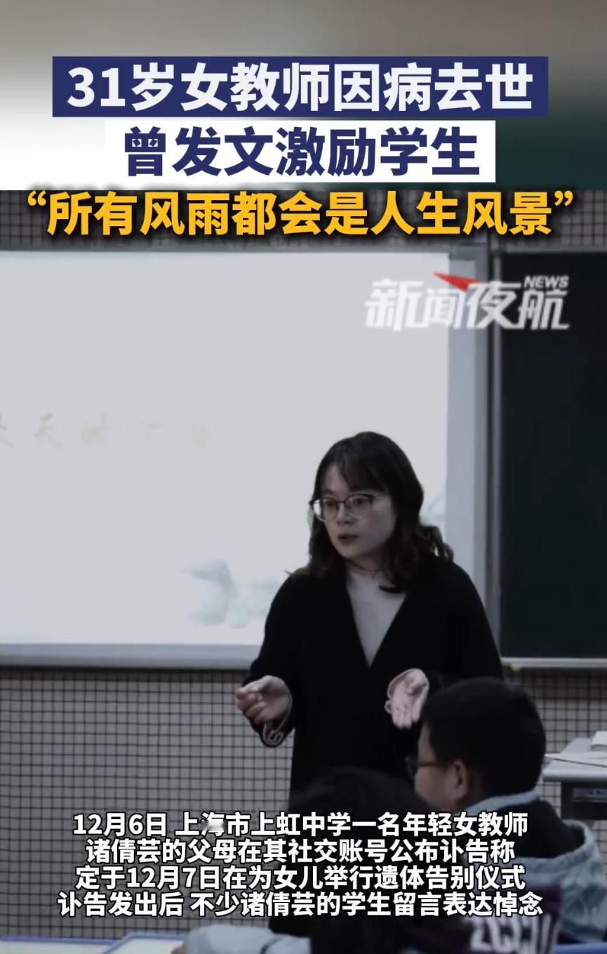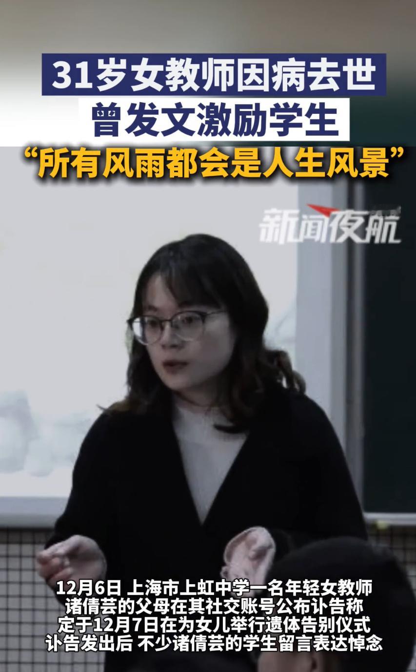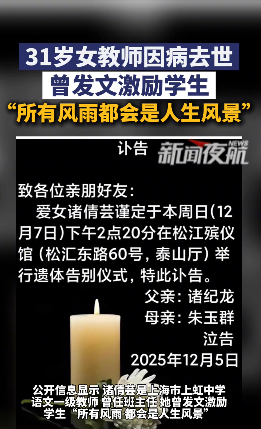 上海一31岁女教师因病去世把“风雨皆为风景”写进学生青春,病中还喊着“天就快晴了”,可自己却没等到那片阳光。12小时超长工作、错过正餐靠外卖续命、带腹痛上课,这些教师群体的日常,在她31岁的生命里成了无法挽回的遗憾。我们总歌颂教师“无私奉献”,却忘了他们首先是需要健康的普通人。“后悔没好好吃饭”的叹息,该叫醒所有“硬扛”的职场人——敬业从不是透支生命的理由,守护好自己,才能长久照亮别人。