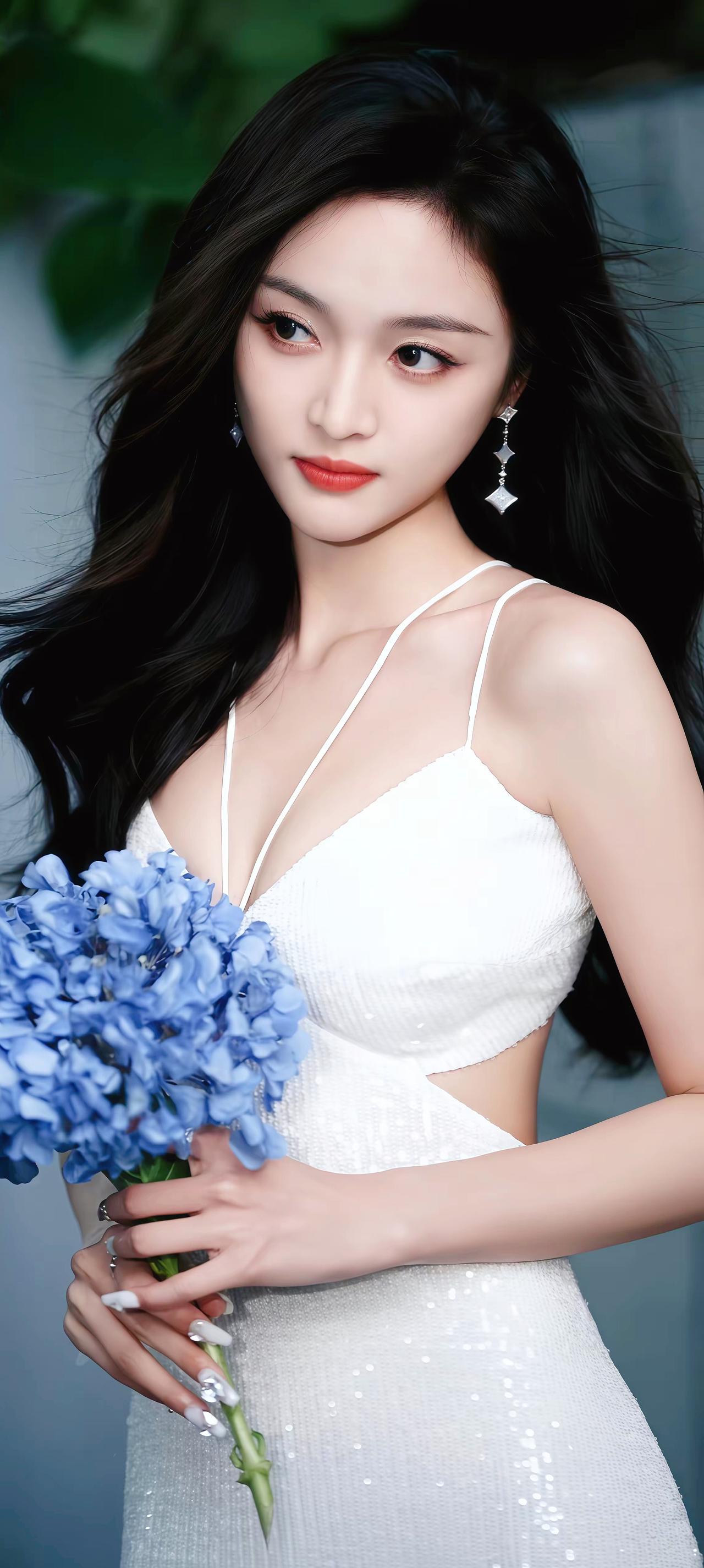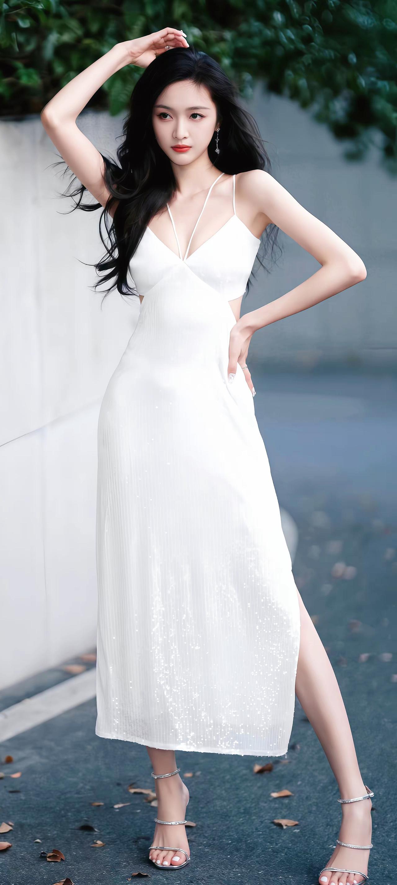 《白裙佳人》原创诗词 原创看图片配诗 素裙裁雪缀星芒,云鬓风轻落晚光。 皓腕斜