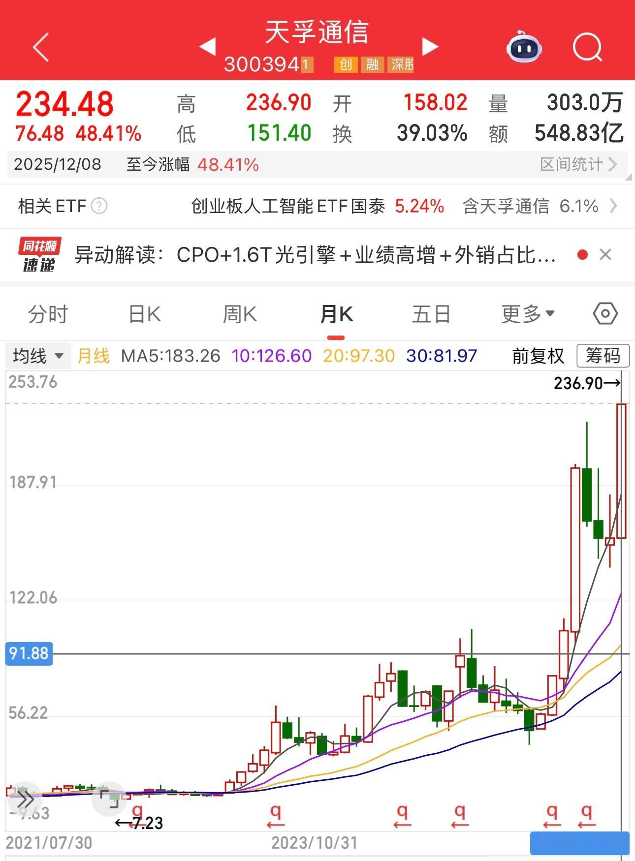 天哪,A股的钱都被新科技易中天赚去了,中际旭创和天孚通信又创历史新高,天孚通信这个月涨48%,上个月没上车的人,现在流口水,叹气落泪中。股市不能这样干啊,总涨它们,跌老登,这是朱门酒肉臭,路有冻死骨啊。备注:我没有易中天三家公司股票,看到它们涨,我的老登跌,胃痛。