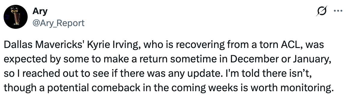 Ary表示,欧文正在从前交叉十字韧带撕裂的伤病中恢复,此前一些人曾经预计他会在12月或1月复出。不过在Ary联系相关人员询问欧文复出的消息时,得到的回复是目前还没有。
