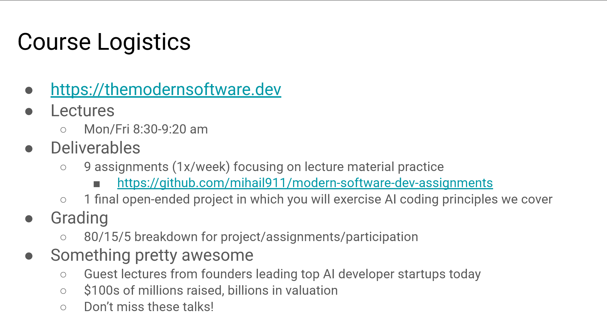 斯坦福新开设的一门教你如何利用LLM提高开发者的生产力的课程:现代软件开发者课程主页: themodernsoftware.dev/课程还在更新中,会逐步放出PPT等资料。在过去的几年里,大型语言模型引入了一个在软件开发中具有革命性的新范式。传统的软件开发生命周期正被人工智能自动化在每个阶段所改变,这引发了一个问题:下一代软件工程师应该如何利用这些进展,提升十倍生产力并为他们的职业生涯做好准备?本课程展示了现代人工智能工具不仅能提高开发者的生产力,还能使软件工程更加普及,惠及更广泛的受众。我们将展示,软件开发已从零到一的代码创建,发展为一个迭代工作流程,包括计划、与人工智能协作生成、修改和重复。学生将掌握传统软件工程挑战背后的理论,以及当前通过前沿的人工智能工具解决这些问题的实践。通过实际的工程任务和行业先锋的讲座,学生将获得使用人工智能辅助开发、自动化测试、智能文档编写和安全漏洞检测的实践经验。在课程结束时,您将清晰理解如何将先进的语言模型集成到复杂的开发工作流程中,并避免常见的陷阱。科技先锋官