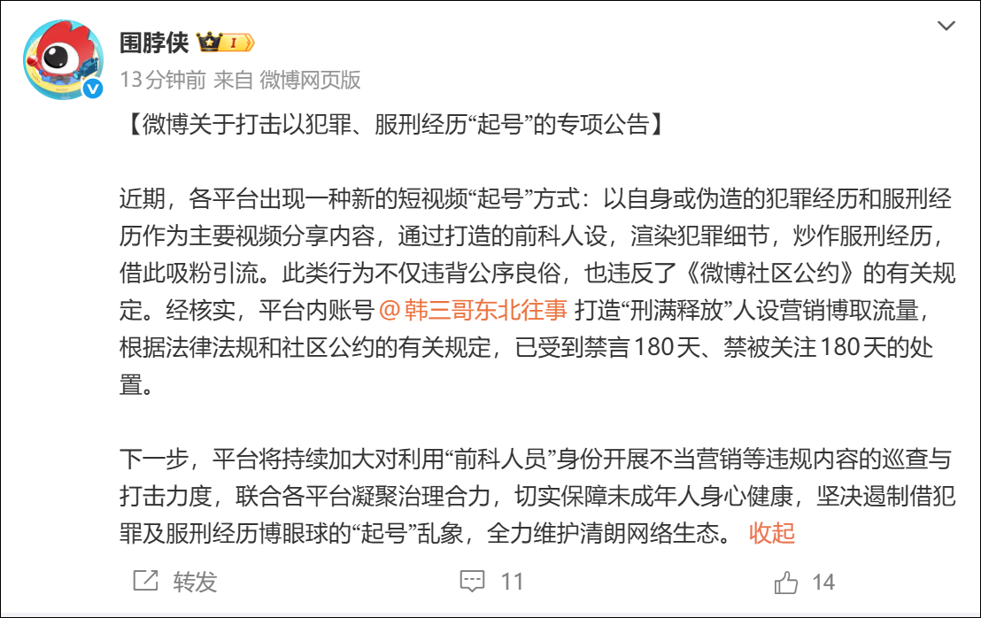 近期,各平台出现一种新的短视频“起号”方式:以自身或伪造的犯罪经历和服刑经历作为主要视频分享内容,通过打造的前科人设,渲染犯罪细节,炒作服刑经历,借此吸粉引流。此类行为不仅违背公序良俗,也违反了《微博社区公约》的有关规定。经核实,平台内账号@韩三哥东北往事打造“刑满释放”人设营销博取流量,根据法律法规和社区公约的有关规定,已受到禁言180天、禁被关注180天的处置。