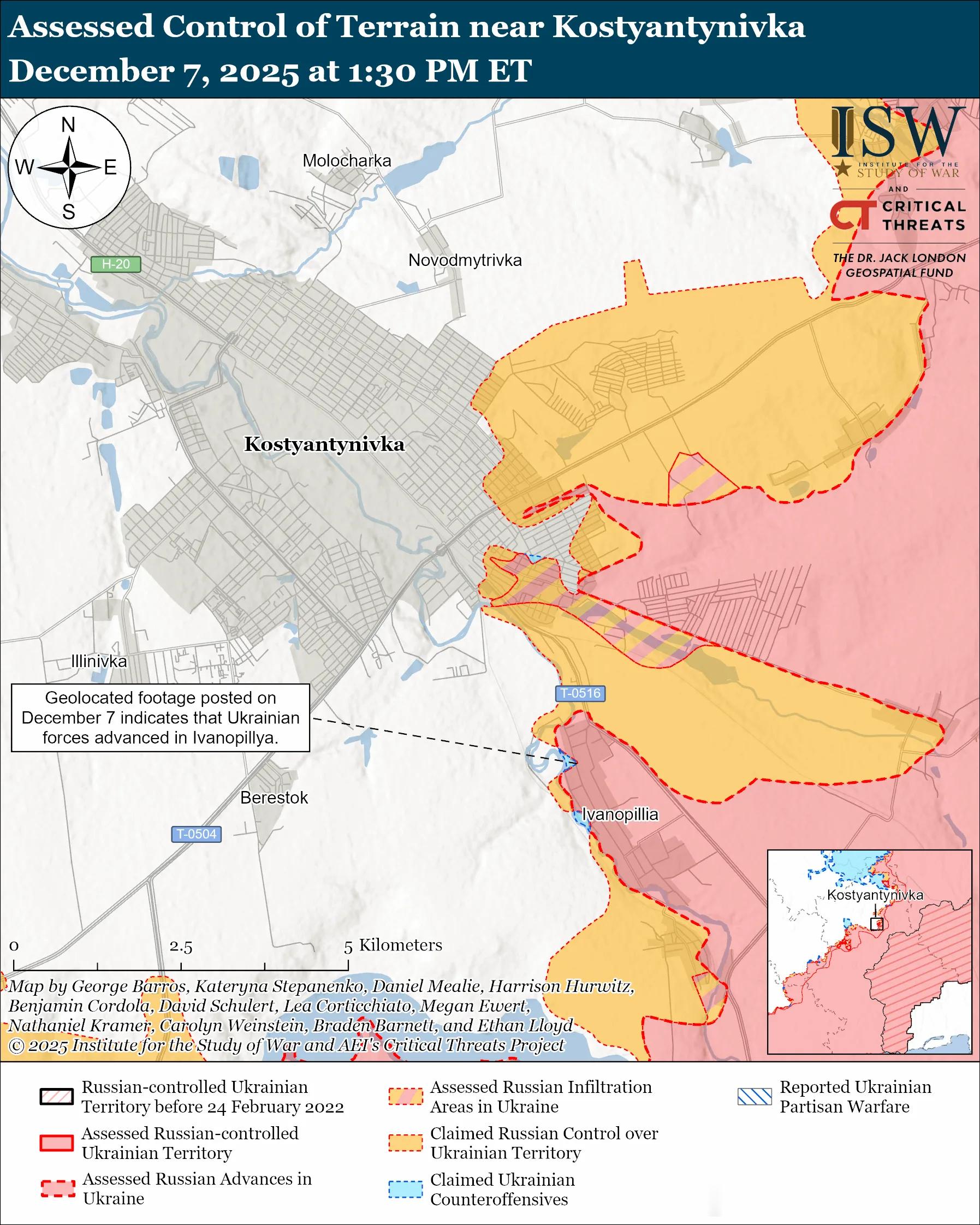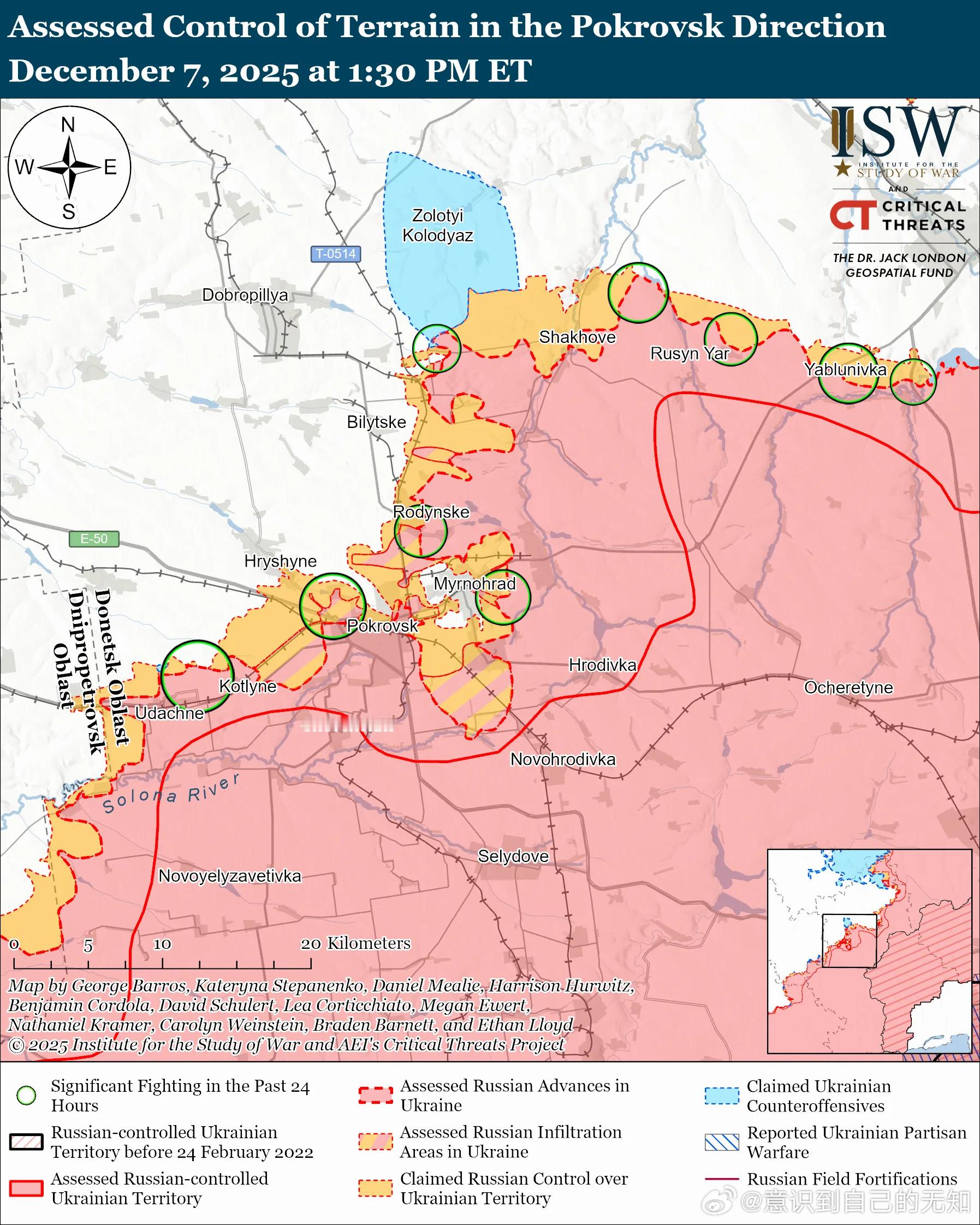 俄军主要行动3俄军目标:占领顿涅茨克州全境,并向第聂伯罗彼得罗夫斯克州推进。12月7日俄军继续向锡维尔斯克方向发起进攻,但并未取得确切进展。评估的俄军渗透:12 月 6 日发布的地理定位视频显示,一名俄罗斯军人在锡维尔斯克东部活动,俄军在锡维尔斯克市中心的一栋建筑物上升起旗帜。ISW 评估认为这是俄军的渗透任务。未经证实的说法:俄罗斯军事博客作者声称,俄军在锡韦尔斯克东北部和南部、普拉托尼夫卡以西、扎基特涅东部(均位于锡韦尔斯克西北部)、奥泽尔涅西北部(位于锡韦尔斯克西北部)以及斯维亚托-波克罗夫斯克南部推进。俄罗斯声称占领的区域范围:12 月 6 日发布的地理定位视频显示,俄第 88 摩步旅(第 3 合成集团军 [CAA],南部军区 [SMD])袭击了斯维亚托-波克罗夫斯克东北部(锡韦尔斯克西南部)一栋被乌克兰占领的建筑物——此前俄方声称,俄军在该地区保持着存在。12月6日和7日俄军在锡韦尔斯克附近及城内发动进攻;在锡韦尔斯克西北部的扬皮尔、扎基特涅和德罗尼夫卡附近;在锡韦尔斯克东北部的谢列布里扬卡附近;以及在锡韦尔斯克西南部的费多里夫卡和瓦休基夫卡附近,并向帕泽诺和尼基福里夫卡方向发动进攻。俄罗斯军事博客作者声称,乌克兰军队在奥泽尔内和尼基福里夫卡附近进行了反击。一位俄罗斯军事博主声称,俄军对途经斯维亚托-波克罗夫斯克的 T-0513 莱曼-索莱达尔公路的南部路段拥有实际控制权和火力控制权,并对该公路的北部路段拥有火力控制权。作战序列:据报道俄第16特种部队旅(俄罗斯总参谋部情报总局[GRU])的无人机操作员正在迪布罗瓦(锡韦尔斯克西北部)附近的森林地区进行侦察。第7摩步旅(第3集团军)正在锡韦尔斯克附近作战。第6摩步旅(第3集团军)的“闪电”无人机操作员正在锡韦尔斯克对乌克兰军队进行打击。乌克兰军队最近向科斯特扬季尼夫卡-德鲁日基夫卡战术区推进。评估乌克兰的进展:12 月 7 日发布的地理定位视频显示,乌克兰军队在伊万诺皮利亚西北部(科斯蒂安蒂尼夫卡以南)取得了进展。未经证实的俄军推进:俄罗斯军事博客声称,俄军占领了索菲伊夫卡(位于德鲁日基夫卡西南方),推进至普里维利亚和明基夫卡(均位于科斯蒂扬蒂尼夫卡东北方)郊区,并向鲁辛亚尔(位于科斯蒂扬蒂尼夫卡西南方)附近推进。俄罗斯军事博客还声称,俄军推进至维罗柳比夫卡中部(位于科斯蒂扬蒂尼夫卡北部),进入别济米亚内北部,并占领了克雷诺韦(均位于维罗柳比夫卡正西方向)。这些说法与俄罗斯国防部12月5日发布的俄军占领别济米亚内和克雷诺韦的声明相符。ISW 继续评估认为,俄罗斯国防部提出这一说法是俄罗斯为达到信息和政治目的而夸大其进展的更广泛努力的一部分,并且观察到俄军使用类似的策略,例如在渗透任务中升旗,以虚假的进展来达到信息效果。俄军在科斯特扬季尼夫卡附近发动进攻;从Kostyantynivka以北前往Virolyubivka;位于 Kostyantynivka 东北部,位于 Novomarkove 和 Minkivka 之间;位于 Kostyantynivka 东南部,靠近 Oleksandro-Shultyne; Kostyantynivka 以南靠近Shcherbynivka 和Berestok、Pleshchiivka 和Ivanopillya 方向; Kostyantynivka 西南方向,靠近 Yablunivka 和 Stepanivka 方向;在Druzhkivka西南部靠近Sofiivka和Novopavlivka的方向。俄罗斯军事博主声称乌克兰军队在克林诺夫和贝济米亚内附近发动反击。 俄罗斯军事博客作者于12月7日声称,乌克兰军队摧毁了位于普里维利亚东北郊(科斯蒂扬尼夫卡东北部)的M-03斯拉维扬斯克-巴赫穆特公路沿线的一座乌克兰控制的水坝,目的是淹没俄军试图推进和扩展后勤补给的区域。12月7日发布的地理定位视频显示,普里维利亚东北部M-03公路沿线的一座桥梁被摧毁。水坝的摧毁可能会阻碍俄军向东推进至赫罗米夫卡(普里维利亚东北部)方向。作战序列:俄第1194摩步团(第4摩步旅,第3集团军)第13“鲁西奇”突击分队的FPV无人机操作员正在伊万诺皮利亚打击乌克兰阵地。第102摩步团(第150摩步师,第8集团军)的FPV无人机操作员正在索菲伊夫卡附近打击乌克兰阵地。第58独立特种部队营(非正式名称为“猎人”特种部队分队)(第51集团军)的无人机操作员正在科斯蒂安蒂尼夫卡附近打击乌克兰阵地。12月7日俄军继续在多布罗皮利亚方向发动进攻,但并未取得确切进展。未经证实的说法:一位俄罗斯军事博主声称,俄军占领了新沙霍韦,并向托列茨克南部推进(均位于多布罗皮利亚以东)。12月6日和7日,俄军在多布罗皮利亚以东的托列茨克和新沙霍韦附近以及新顿巴斯方向发动进攻。12月7日俄军继续向波克罗夫斯克方向发起进攻,但并未取得确切进展。未经证实的说法:俄罗斯国防部声称俄军占领了里夫内(位于波克罗夫斯克正东)。俄罗斯军事博客作者声称俄军向波克罗夫斯克以西、格里申内南部(波克罗夫斯克西北部)、乌达奇内北部(波克罗夫斯克西南部)以及米尔诺赫拉德中部(波克罗夫斯克以东)推进。12月6日和7日,俄军在波克罗夫斯克西北部的格里申内附近、波克罗夫斯克北部的罗丁斯克附近以及比利茨克方向、波克罗夫斯克东北部的切尔沃尼(克拉斯尼)莱曼和新经济城附近、波克罗夫斯克东部的米尔诺赫拉德附近及城内、以及波克罗夫斯克西南部的科特利内、乌达奇内以及莫洛杰茨克方向发动进攻。乌克兰东部作战特遣队于 12 月 6 日报告称,乌克兰军队继续开展行动,以识别和消灭波