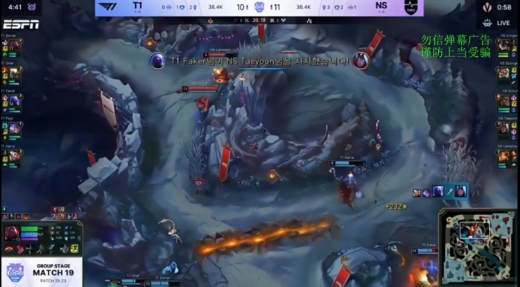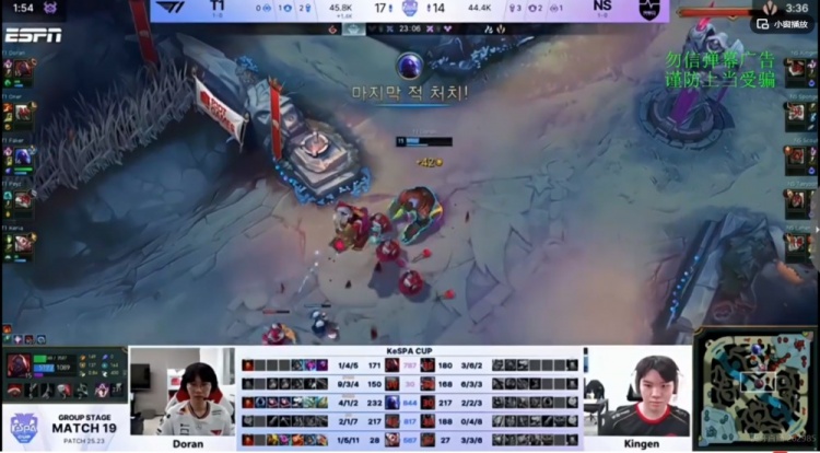 [16:18]T1拿下二小龙,NS用先锋拆掉中一塔!NS打算四人保下,但是绕后埋伏的Doran塞恩被发现了!结果双方一波打出2换2!经济差2K不到!