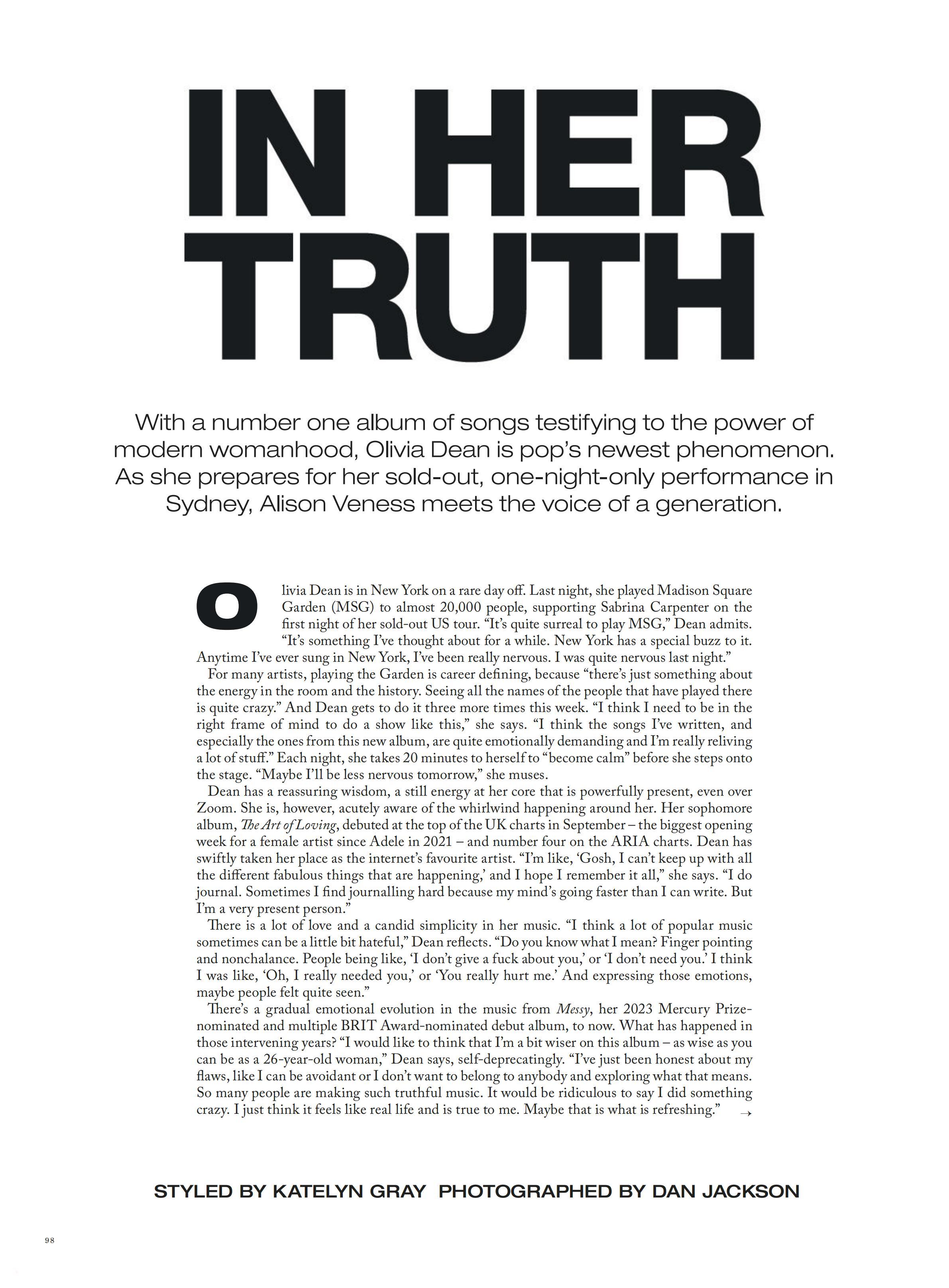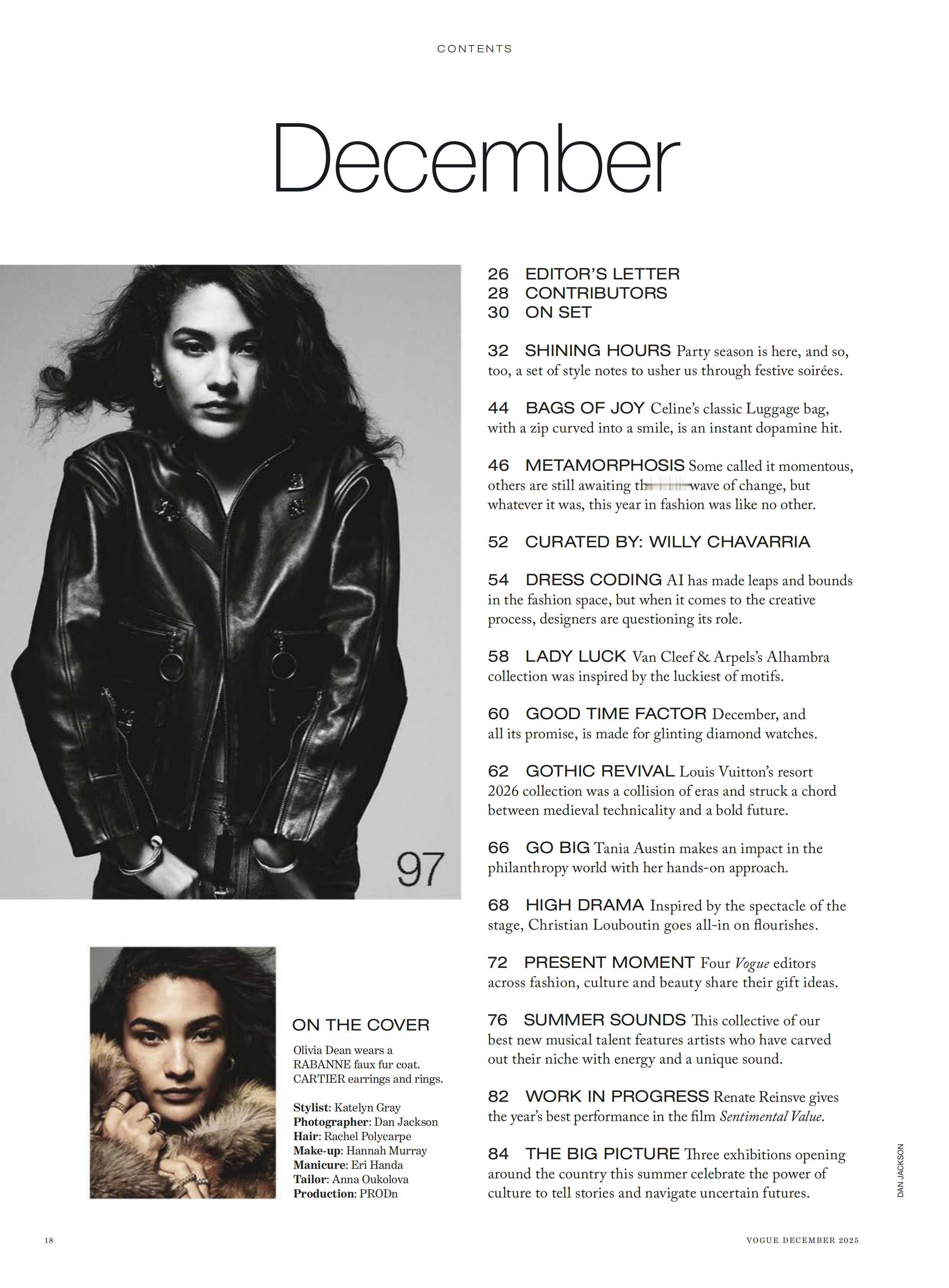 VOGUE Australia December 2025 澳大利亚版 VOGUE 十二月刊 ,拍摄了英国爆红新星 Olivia Dean 作为封面人物 ,这也是她继去年解锁新加坡版后的第二张 VOGUE 封面 ,佩戴 Cartier 珠宝出镜 ,凭借爆单Man I Need 接连入选《滚石》杂志评选 2025 年度百佳歌曲和 Apple Music 评选的 2025 年度 50 佳流行歌曲 ,还顺势撸下了今年格莱美最佳新人提名 ,大势代表哈 ~ 另外去年有签 CHANEL ,倒是今年品牌又是换创意总监又是新季系列发布的也不见相关合作动静 ,就结束了 ?封面 :Olivia Dean 摄影 :Dan Jackson 造型 :Katelyn Gray