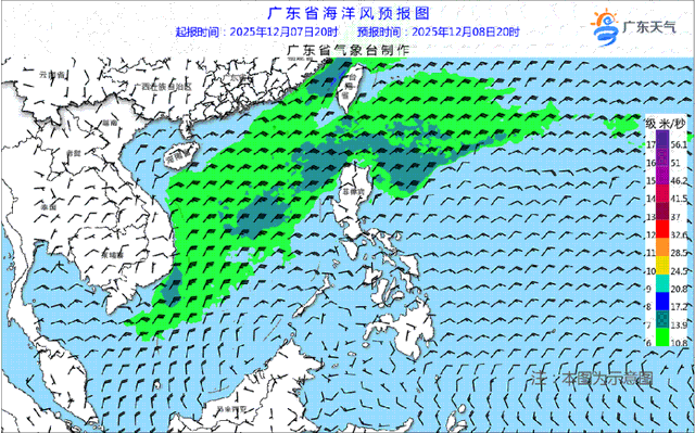 11日夜间开始广东省中东部海面风力重新加到6级阵风7级。