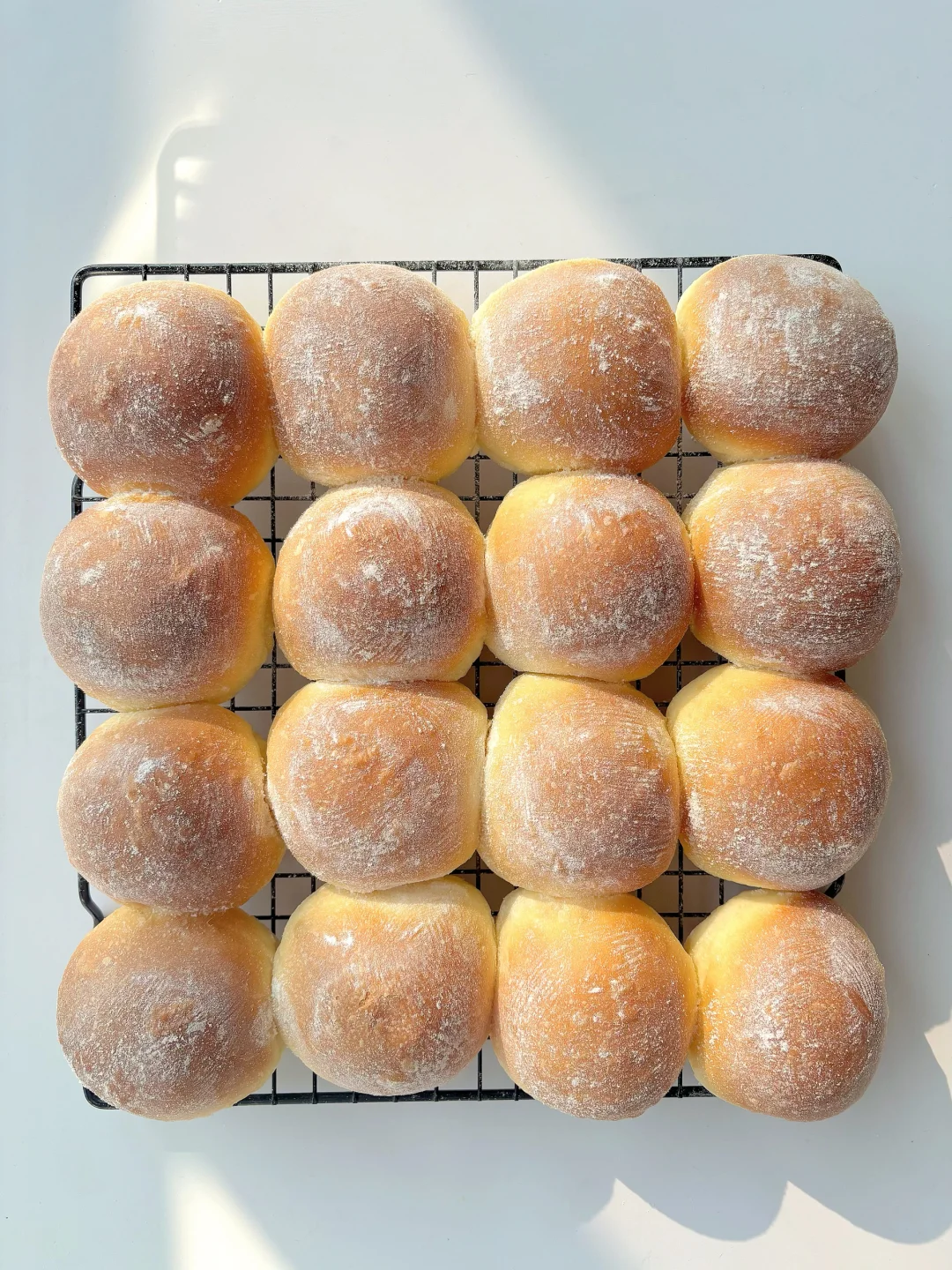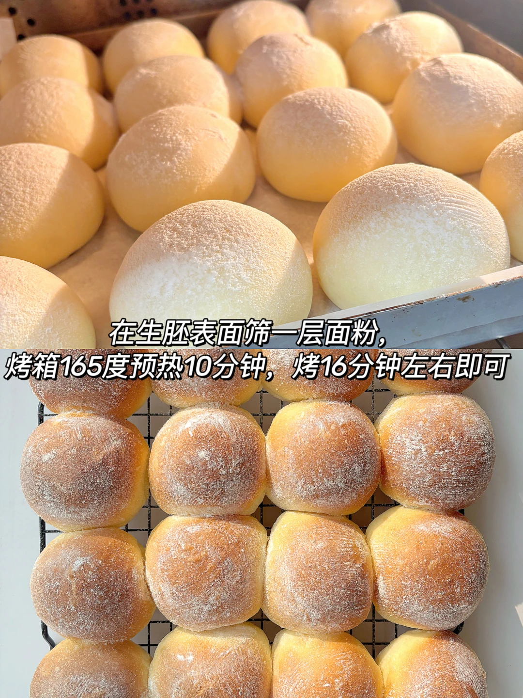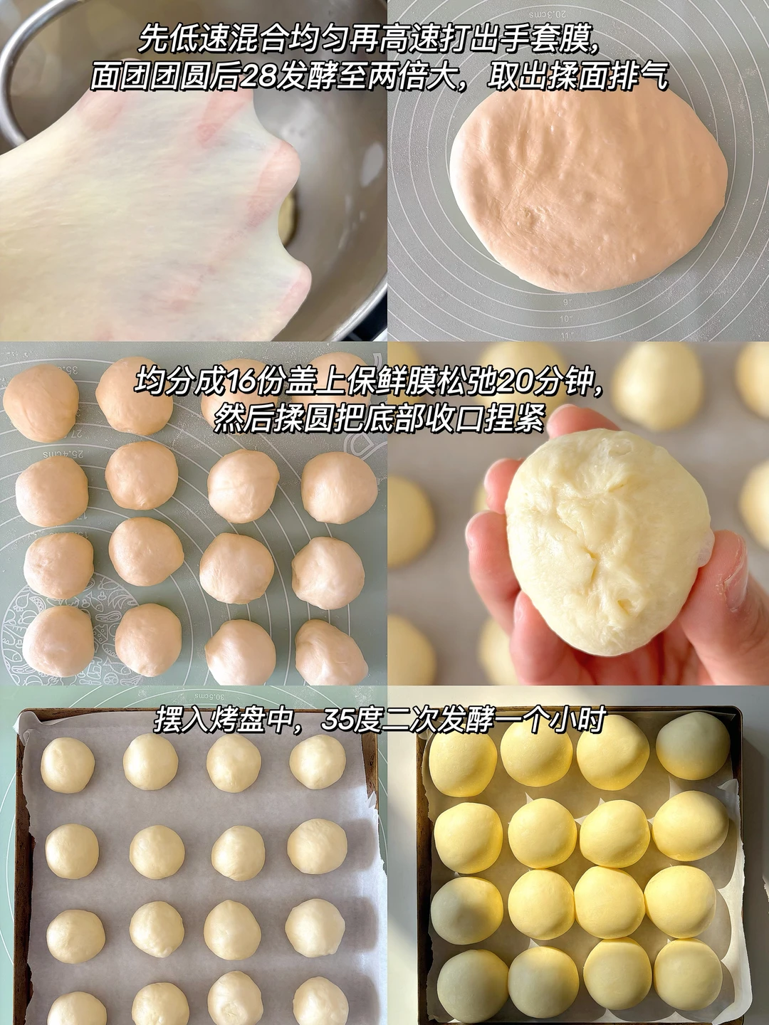 3️⃣取出揉面排气均分成16份,盖上保鲜膜松20分钟,然后揉圆把底部收口捏紧,摆入烤盘中,35度二次发酵一个小时;