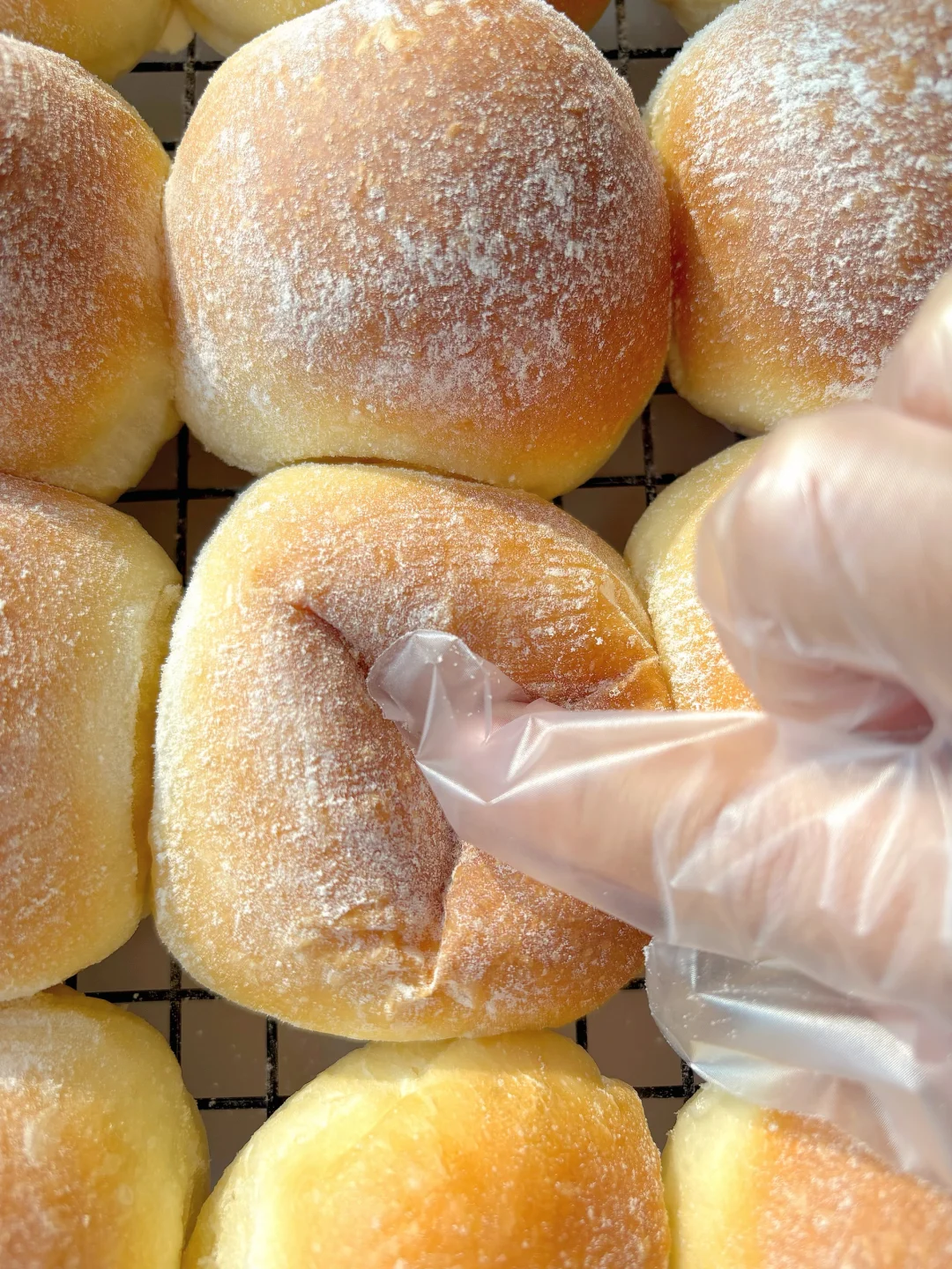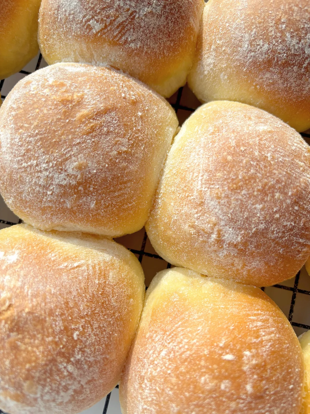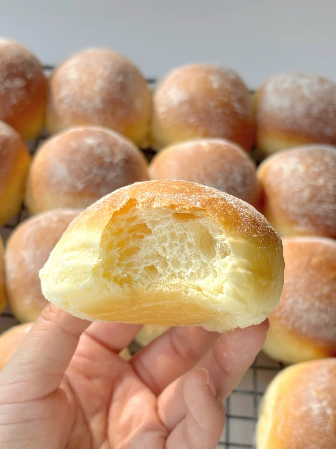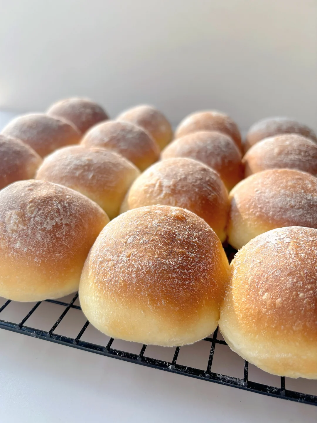 3️⃣取出揉面排气均分成16份,盖上保鲜膜松20分钟,然后揉圆把底部收口捏紧,摆入烤盘中,35度二次发酵一个小时;