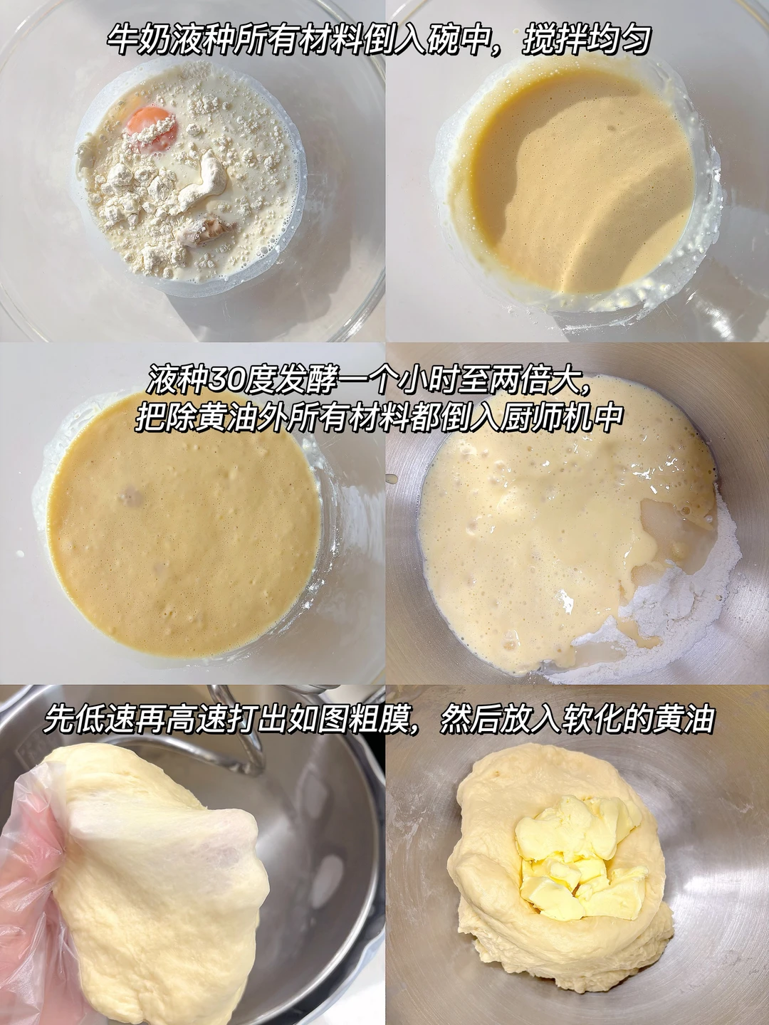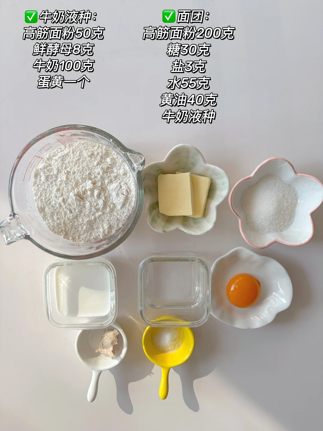 1️⃣ 牛奶液种:高筋面粉50克,鲜酵母8克,牛奶100克,蛋黄一个;