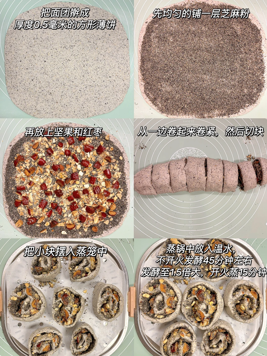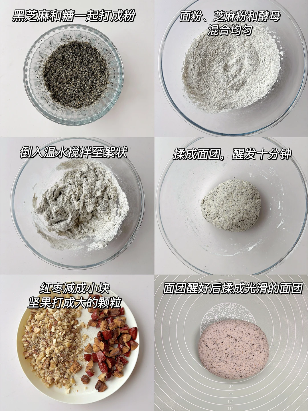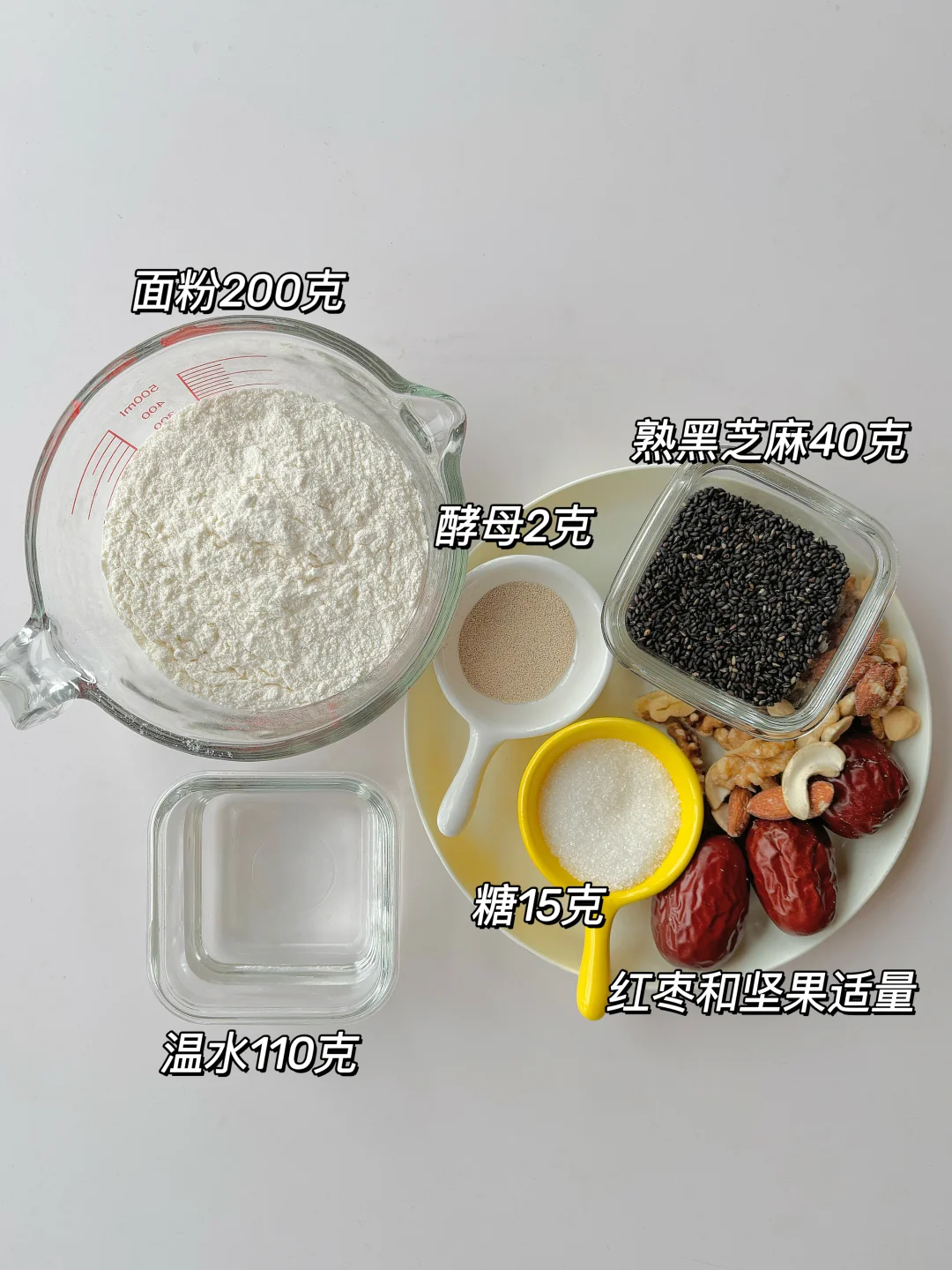 1️⃣面粉200克,酵母2克,熟黑芝麻40克,白糖15克,温水110克,红枣和坚果适量;
