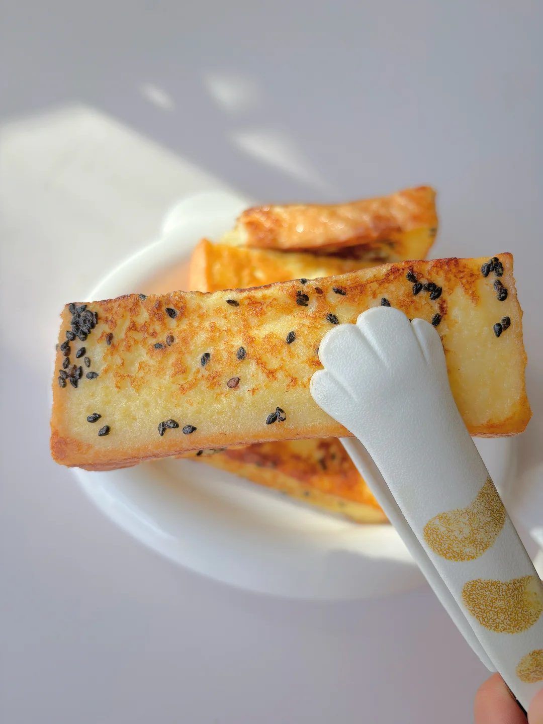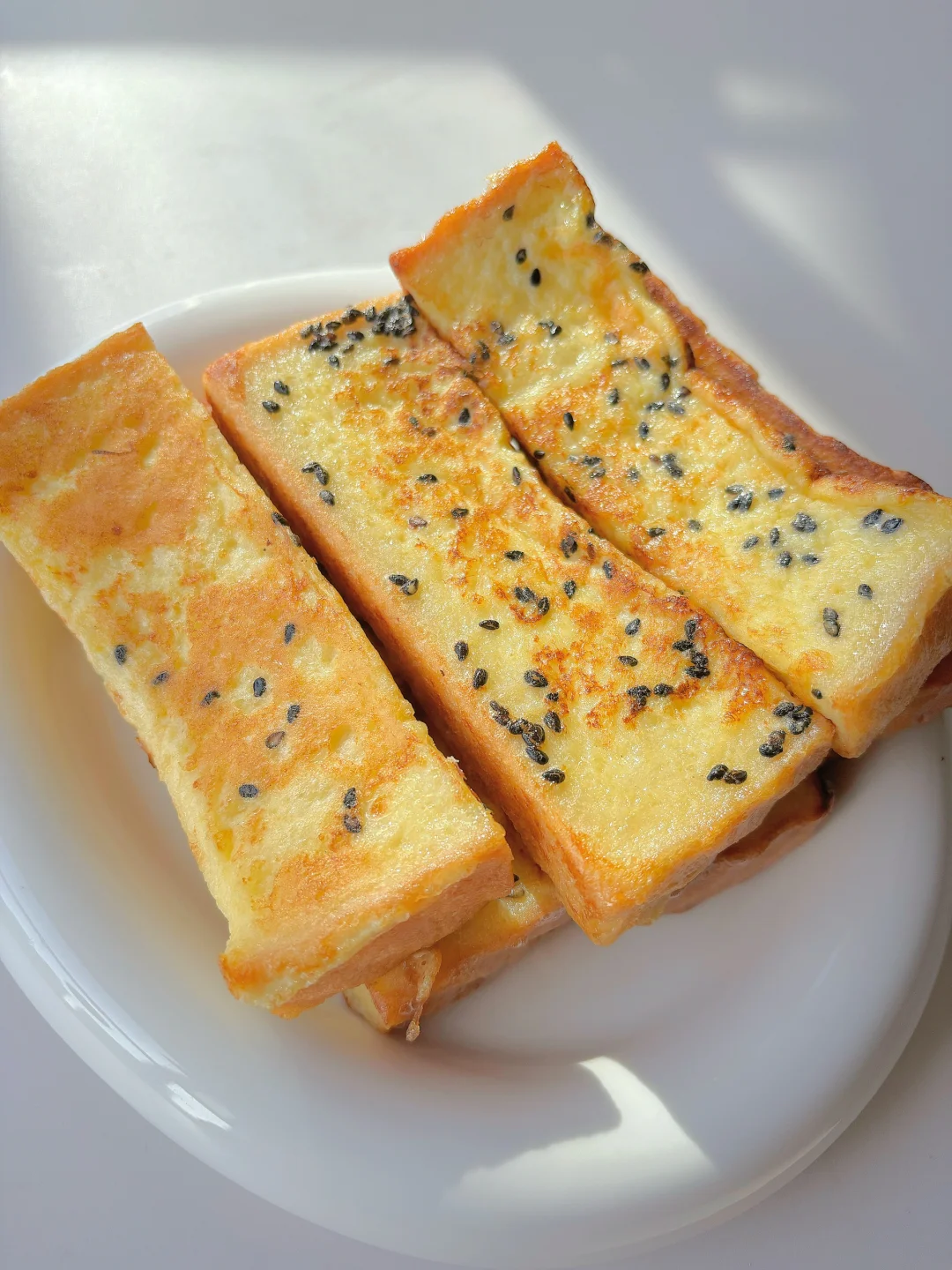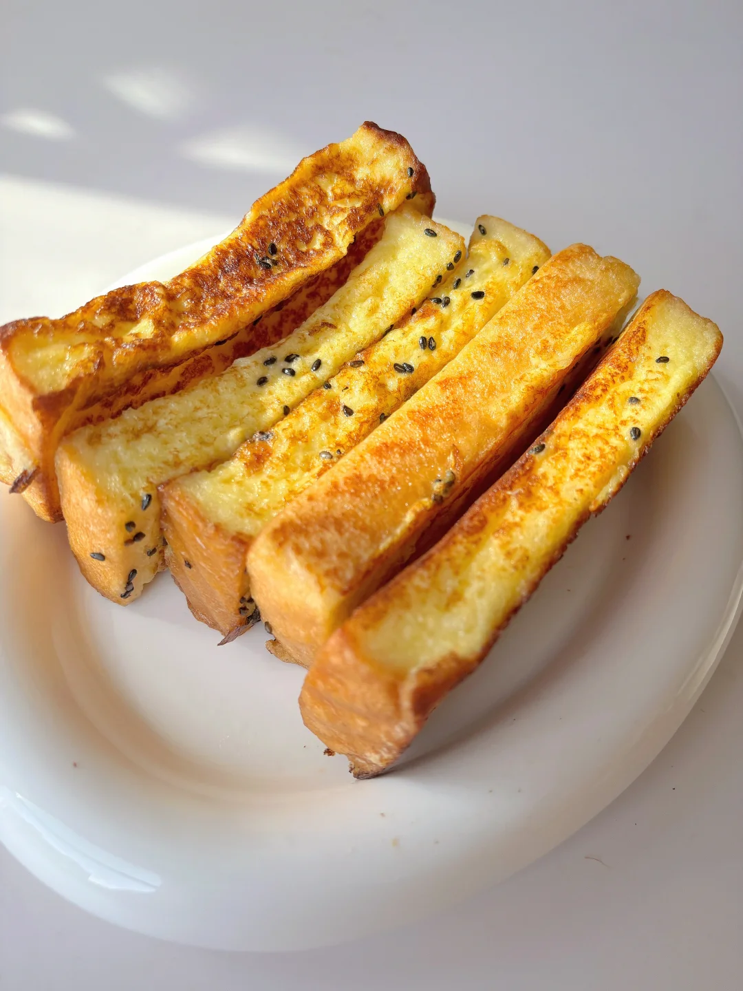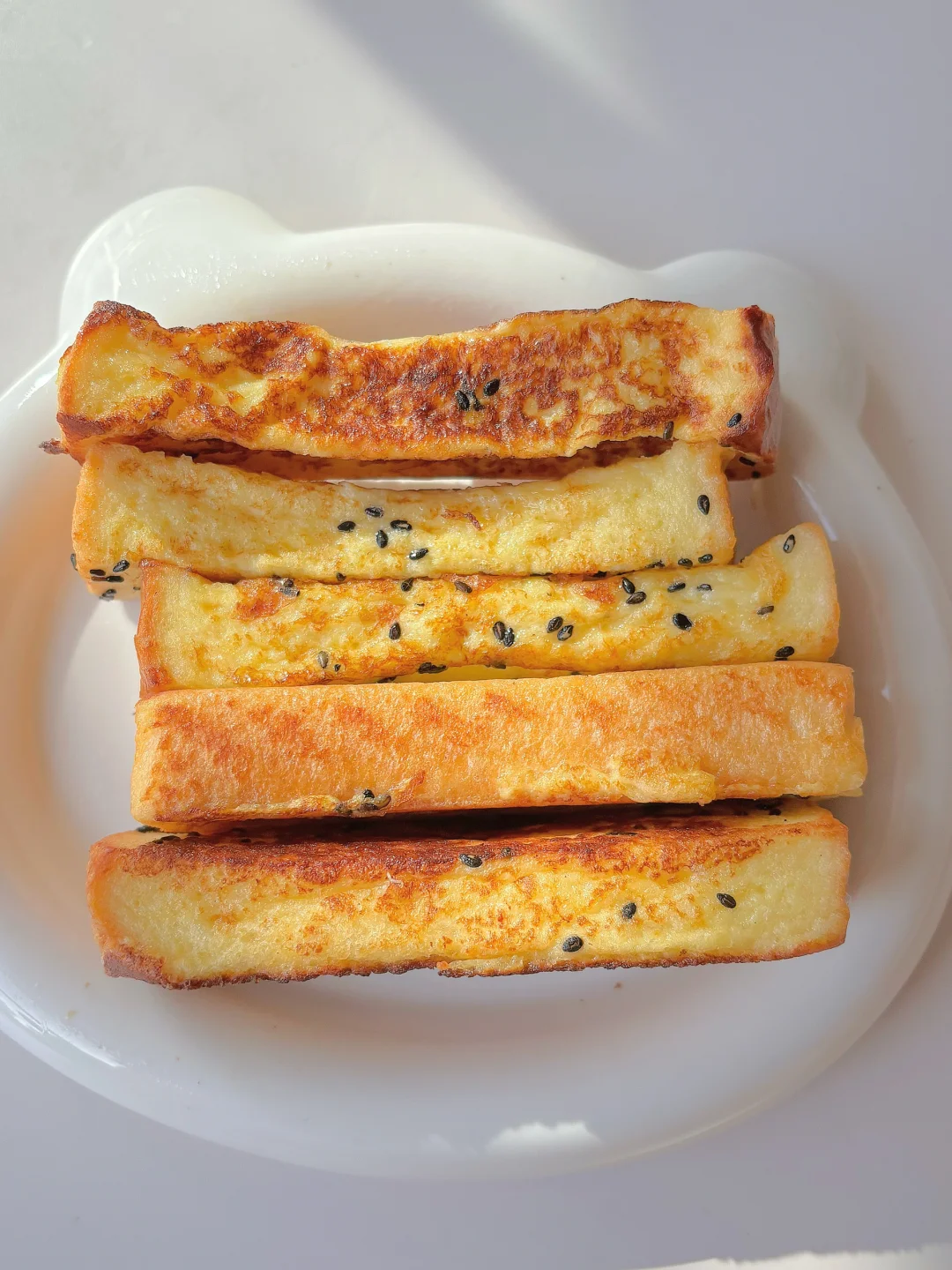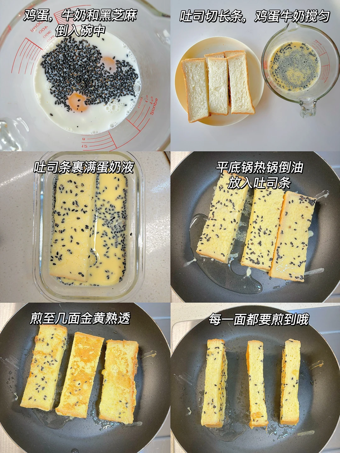 🍞香嫩酥软,手残党也可以做的美食~ 🎈准备食材: 1️⃣厚吐司两片,牛奶70克,鸡蛋两个,熟黑芝麻少许; 🎈制作步骤: 1️⃣ 鸡蛋,牛奶和黑芝麻倒入碗中搅匀,吐司切长条备用; 2️⃣吐司条裹满蛋奶液,平底锅热锅倒油放入吐司条,煎至几面金黄熟透,每一面都要煎到哦。