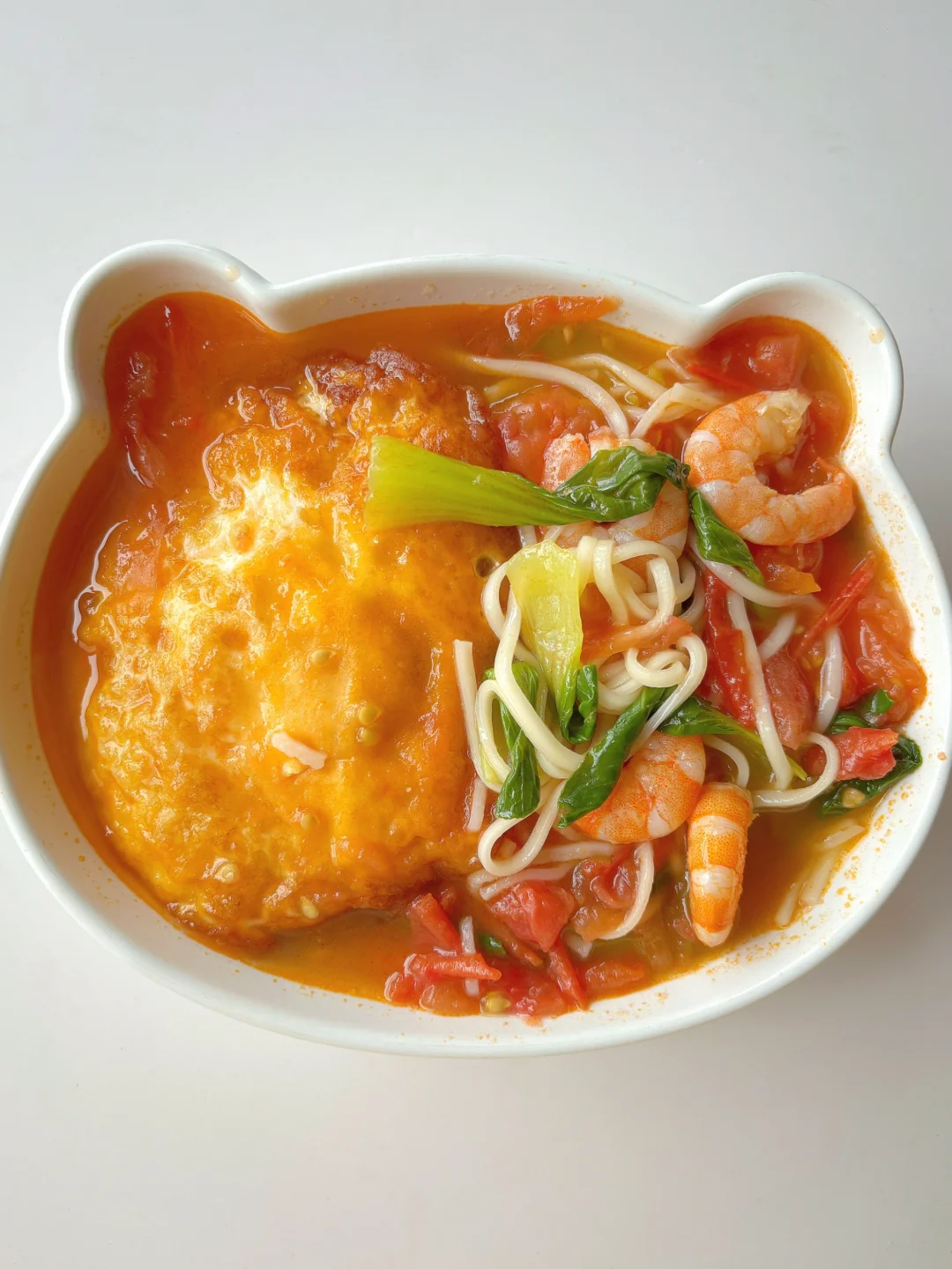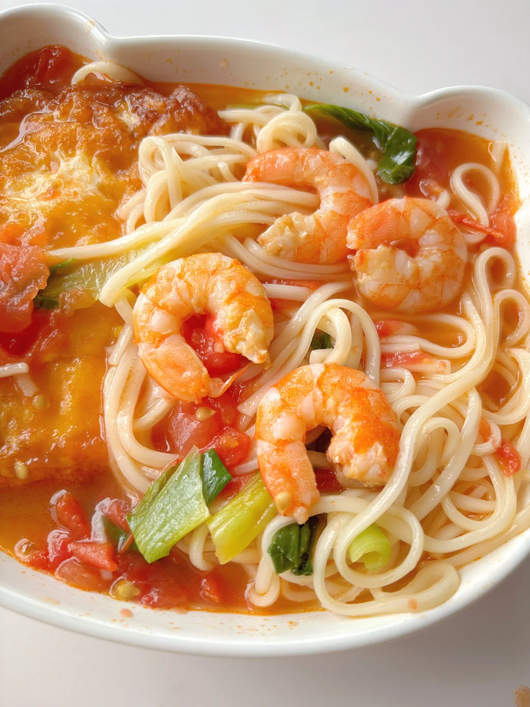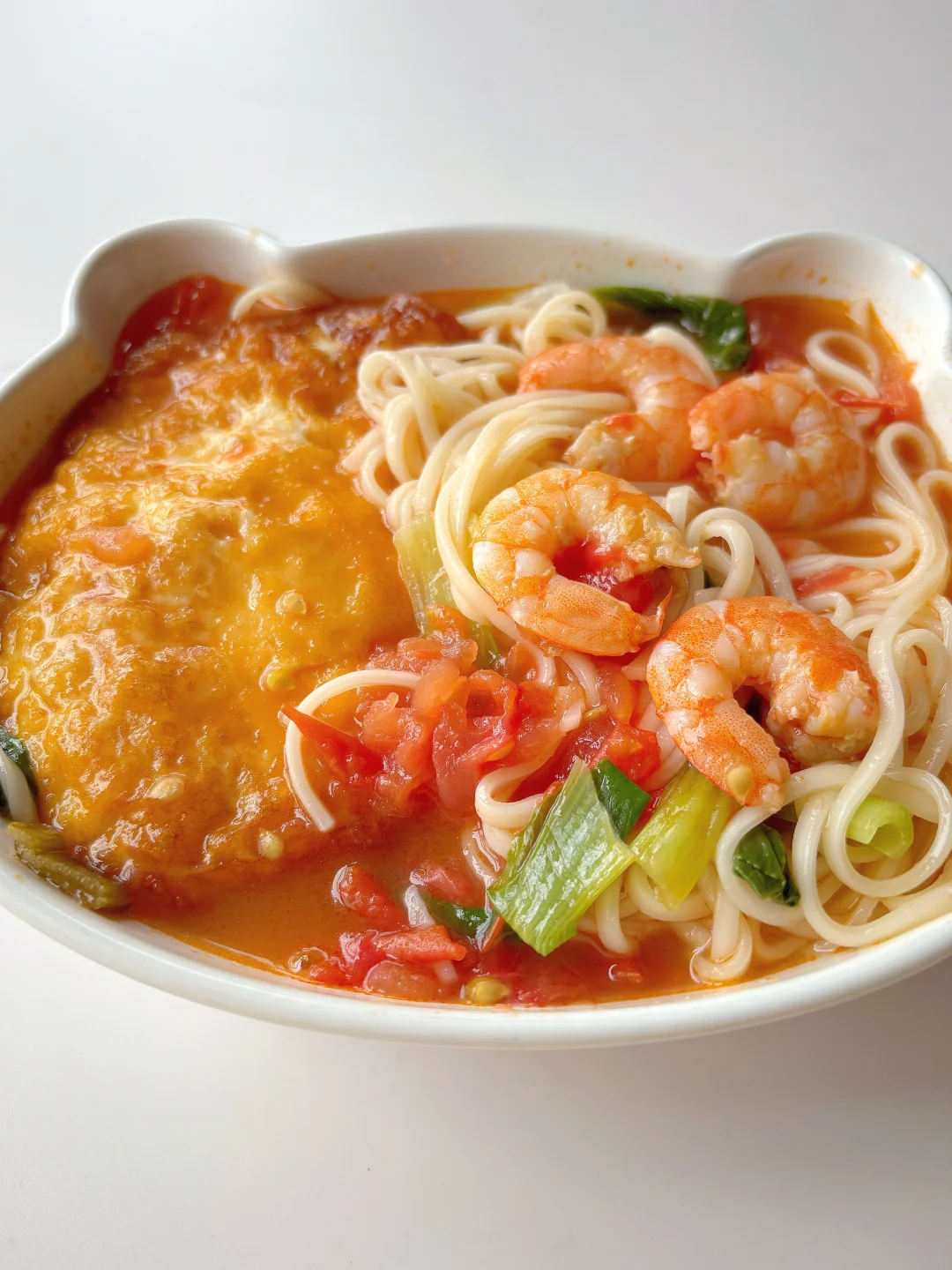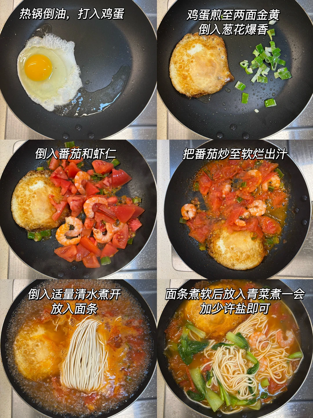 🍅汤汁浓郁,酸甜可口,鲜香美味,宝宝一口气吃了一碗~ 🎈准备食材: 1️⃣番茄一个,虾仁六个,青菜两颗,面条适量; 🎈制作步骤: 1️⃣ 热锅倒油,打入鸡蛋,鸡蛋煎至两面金黄后倒入葱花爆香; 2️⃣倒入番茄和虾仁翻炒均匀,把番茄炒至软烂出汁,倒入适量清水煮开; 3️⃣放入面条,面条煮软后放入青菜再煮一小会,加少许盐即可出锅~