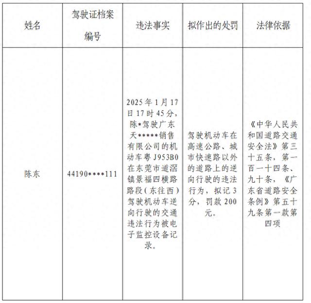 驾驶人陈东,驾驶广东天*****销售有限公司车辆,因道路交通违法行为被电子监控设备记录,您未在限定期限内接受处理。根据《中华人民共和国行政处罚法》第四十四条、《公安机关办理行政案件程序规定》第一百六十八条等规定,现将其对应违法事实、理由和处罚依据公告告知如下,根据《中华人民共和国行政处罚法》第四十五条的规定,您有提出陈述和申辩的权利。如要提出陈述和申辩,请自公告之日起七日内向东莞市公安局交通管理支队道滘大队(地址:东莞市道滘镇粤晖路240号,联系人:叶警官、叶警官,联系电话:0769-88338177)提出,逾期不提出的视为放弃陈述和申辩。(清单附后)
