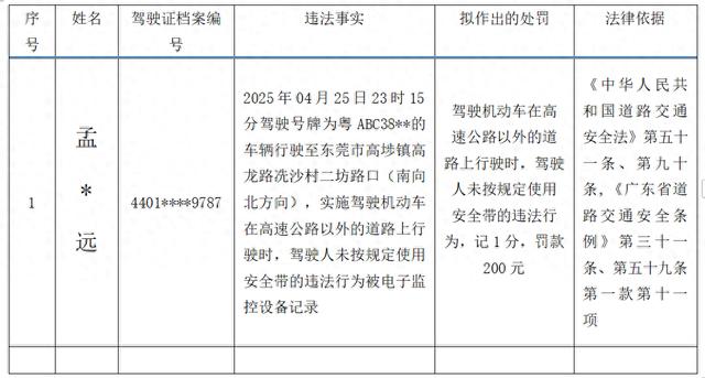 驾驶人孟*远,驾驶广州逸马汽车销售服务有限公司的粤ABC38**的车辆,因道路交通违法行为被电子监控设备记录,当事人未在限定期限内接受处理。根据《中华人民共和国行政处罚法》第四十四条、《公安机关办理行政案件程序规定》第一百八十条等规定,现将其对应违法事实、理由和处罚依据公告告知如下,根据《中华人民共和国行政处罚法》第四十五条的规定,当事人有提出陈述和申辩的权利。如提出陈述和申辩,请自公告之日起七日内向东莞市公安局交通管理支队高埗大队(地址:东莞市高埗镇高埗大道186号,联系人:刘警官,联系电话:0769-88870199)提出,逾期不提出的视为放弃陈述和申辩。