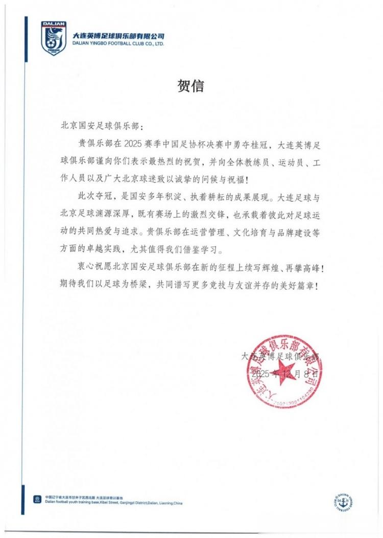 贵俱乐部在2025赛季中国足协杯决赛中勇夺桂冠,大连英博足球俱乐部谨向你们表示最热烈的祝贺,并向全体教练员、运动员、工作人员以及广大北京球迷致以诚挚的问候与祝福!