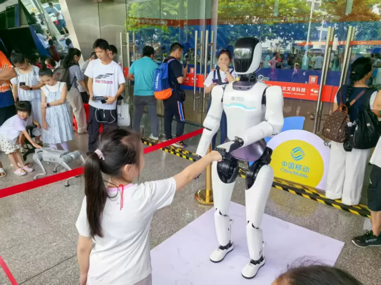 在备受瞩目的AI体验区,贵港移动公司设置了“AI智学堂”科普活动,巧妙融合了趣味与科技。机器人随着音乐演示太极拳,智能机器狗与孩子们亲切互动,引得现场笑声阵阵。技术人员通过5G-A网络、AI大模型等前沿科技展示与讲解,为青少年揭开了人工智能的神秘面纱,激发他们对科学探索的浓厚兴趣。