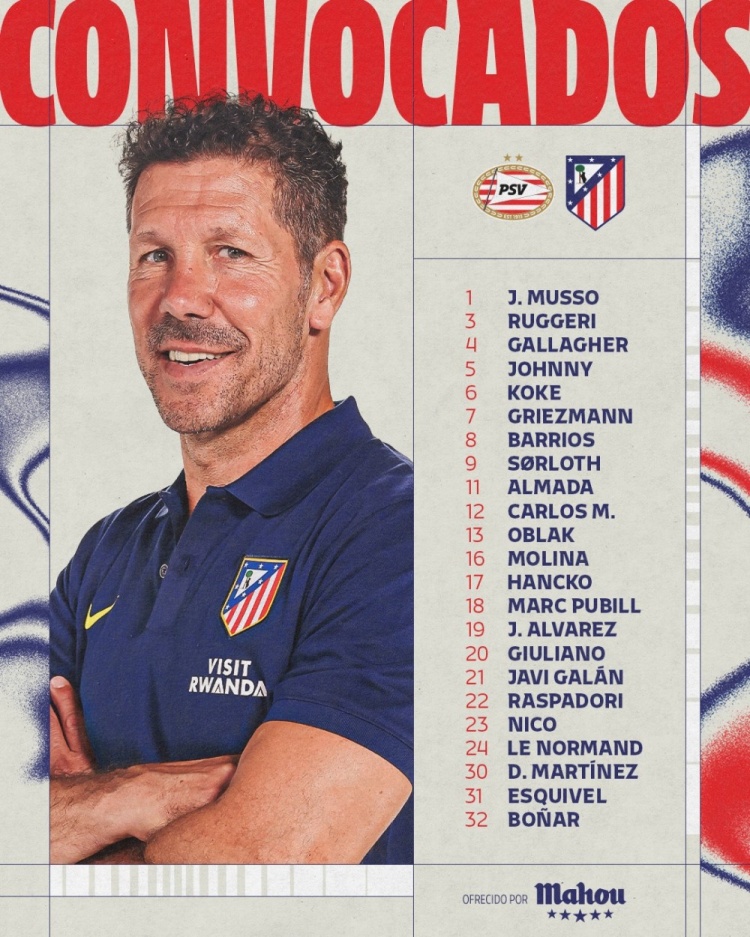前锋:7-格列兹曼、9-瑟尔洛特、11-阿尔马达、19-阿尔瓦雷斯、20-朱利亚诺-西蒙尼、22-拉斯帕多里、23-冈萨雷斯
