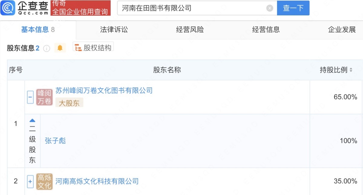 企查查最新工商信息显示,12月5日,河南在田图书有限公司正式成立,公司股权结构显示,张雪峰(本名张子彪)全资持股的苏州峰阅万卷文化图书有限公司为大股东,持股比例65%。