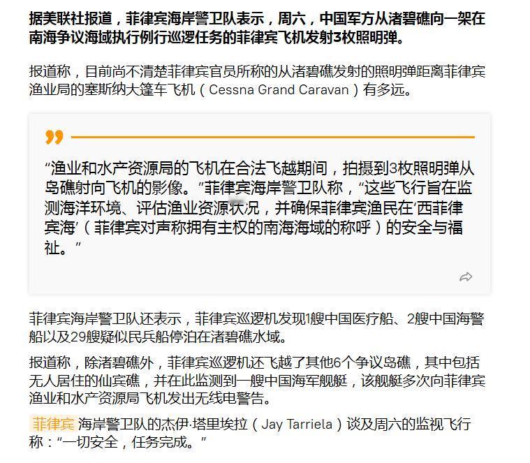 菲律宾称,其渔业局的巡逻机在“合法飞越”我渚碧礁期间遭中方发射3枚照明弹,菲方还称,他们的巡逻机还飞越了我仙宾礁等其他6个岛礁。 说实话,发射照明弹太过客气,太过克制了!我们不想将事闹大,本想驱离就算了。但菲律宾不这么想啊,他们的意图很明显,就是要借此炒作一番。 对于菲律宾的所谓“合法飞越”事件,我有个想法,俗话说,常在河边走,哪有不湿鞋?!有没有可能让菲律宾的鞋也湿一下?? ---