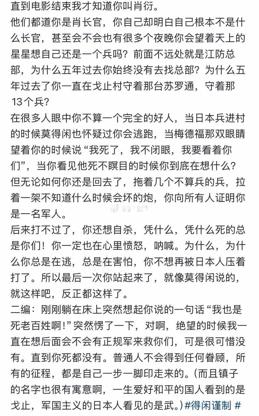 彭昱畅肖衍不脱鞋也没妥协 从畏战怯敌到挺身而出,肖衍的转变令人动容。当坦克碾向村庄,他选择了最壮烈的反击。而临终那句“帮我找双鞋穿上”,更是点睛之笔。这双鞋,是他为自己保留的最后体面,也是向侵略者宣告:即便生命将尽,我的尊严不容践踏。不拖鞋,不妥协,这是中国军人的骨气。