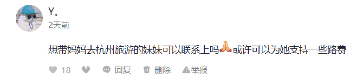 “想带妈妈去杭州旅游的妹妹可以联系上吗?或许可以为她支持一些路费”“在哪里啊,有机会了一定支持下”“最后一个妹妹看得我直掉眼泪……”