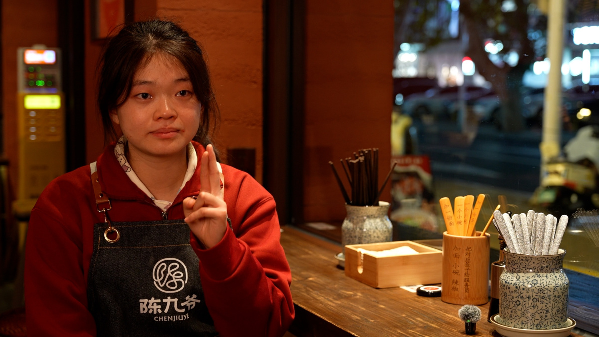 31岁的店长美美作为面馆里的“家长”,她坦言:“我管理员工必须对她们好,要像家长一样对她们好。”先后做过舞蹈老师、快餐店店员,送过快递,摆过摊的她,因为听力障碍,陌生人异样的眼神、工作中不经意的误解,像一根根细刺扎在心上。所以对于员工,她总是以温柔的方式去管理。对于未来的愿望,她的回答很朴素:“希望未来可以吃得好、睡得好、过得好”。