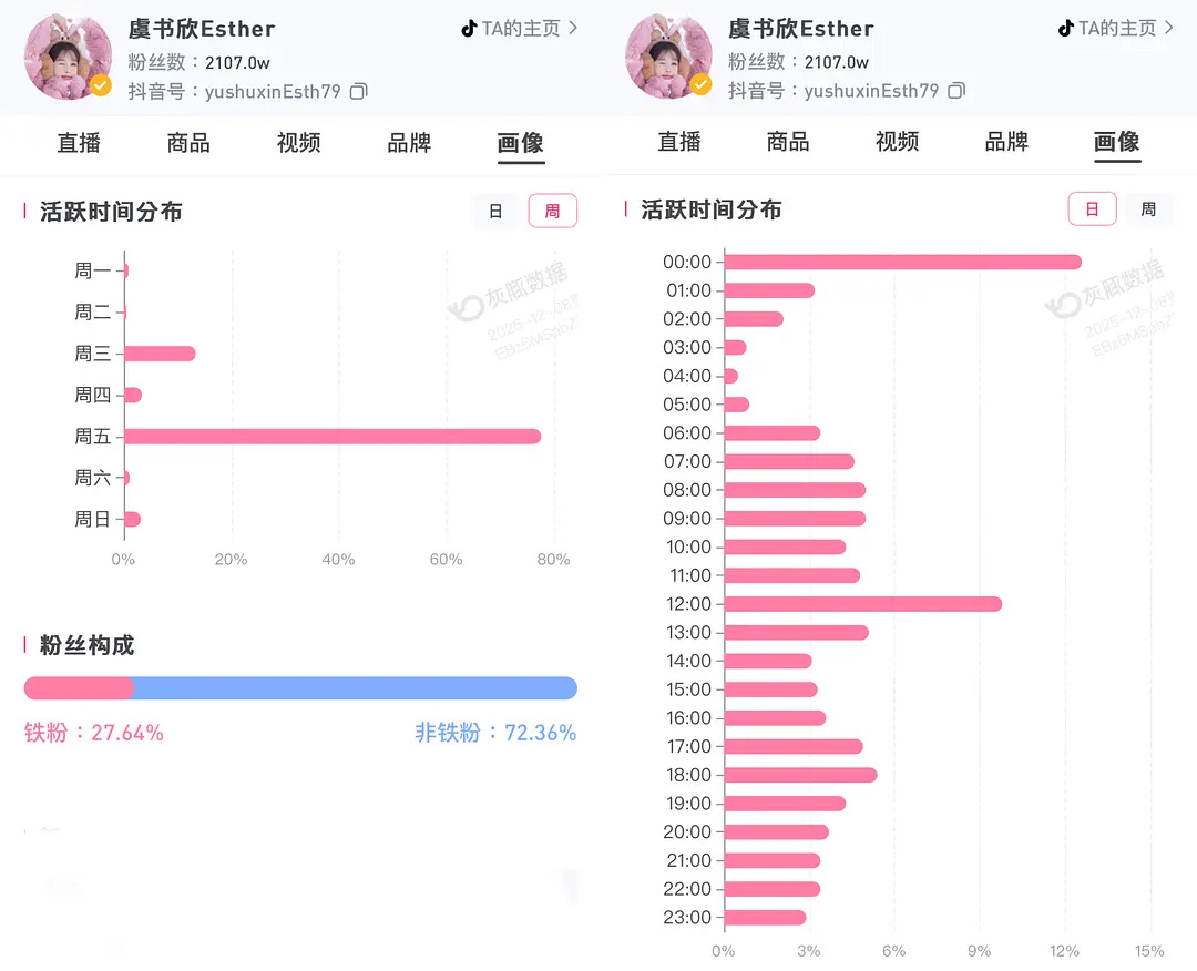 虞书欣抖近30天数据统计,粉丝减少30.8w,剩余粉丝6-17岁占比最高43.03%,活跃时间集中于周五