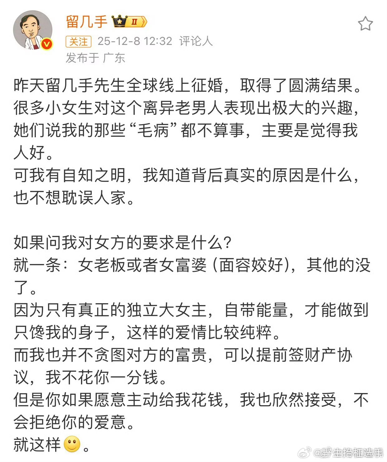 留几手全球征婚 留几手竟然征婚,好离谱啊。。。看这段文案,男人真的很自信啊。。