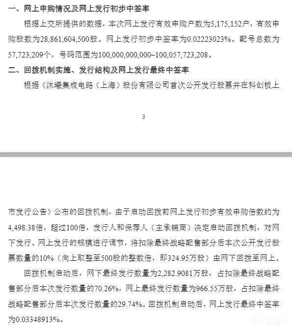 7日,沐曦股份披露网上发行申购情况及中签率公告显示,根据上交所提供的数据,本次网上发行有效申购户数为5175152户,有效申购股数为28861604500股。网上发行初步中签率为0.02223023%。