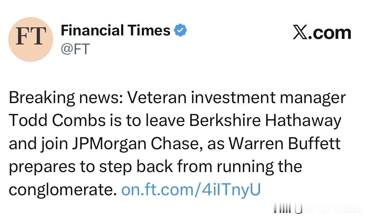 《金融时报》突发新闻:资深投资经理托德·库姆斯将离开巴菲特的伯克希尔·哈撒韦公司,加入摩根大通。 此前沃伦·巴菲特准备卸任,而提名托德·库姆斯成为这家企业集团的掌舵人一职。 此次人事变动会否影响伯克希尔·哈撒韦公司的市场表现?依旧需要拭目以待。但无论如何,对巴菲特而言会是一个小涟漪。