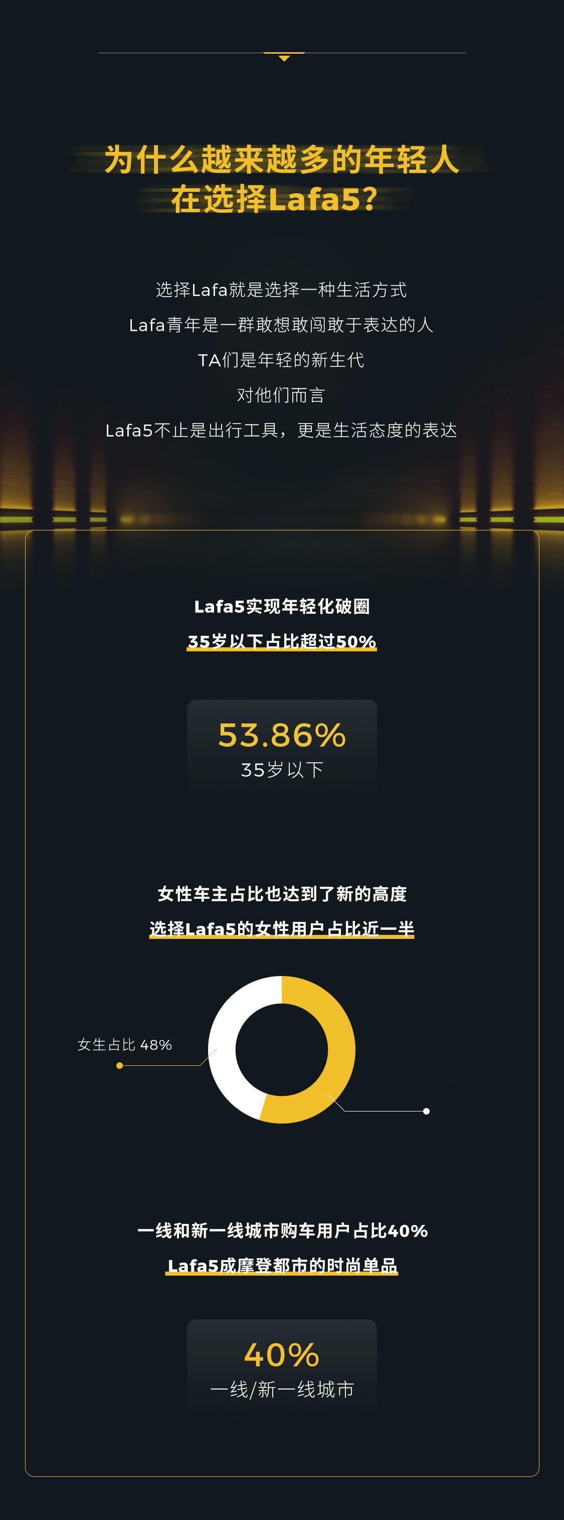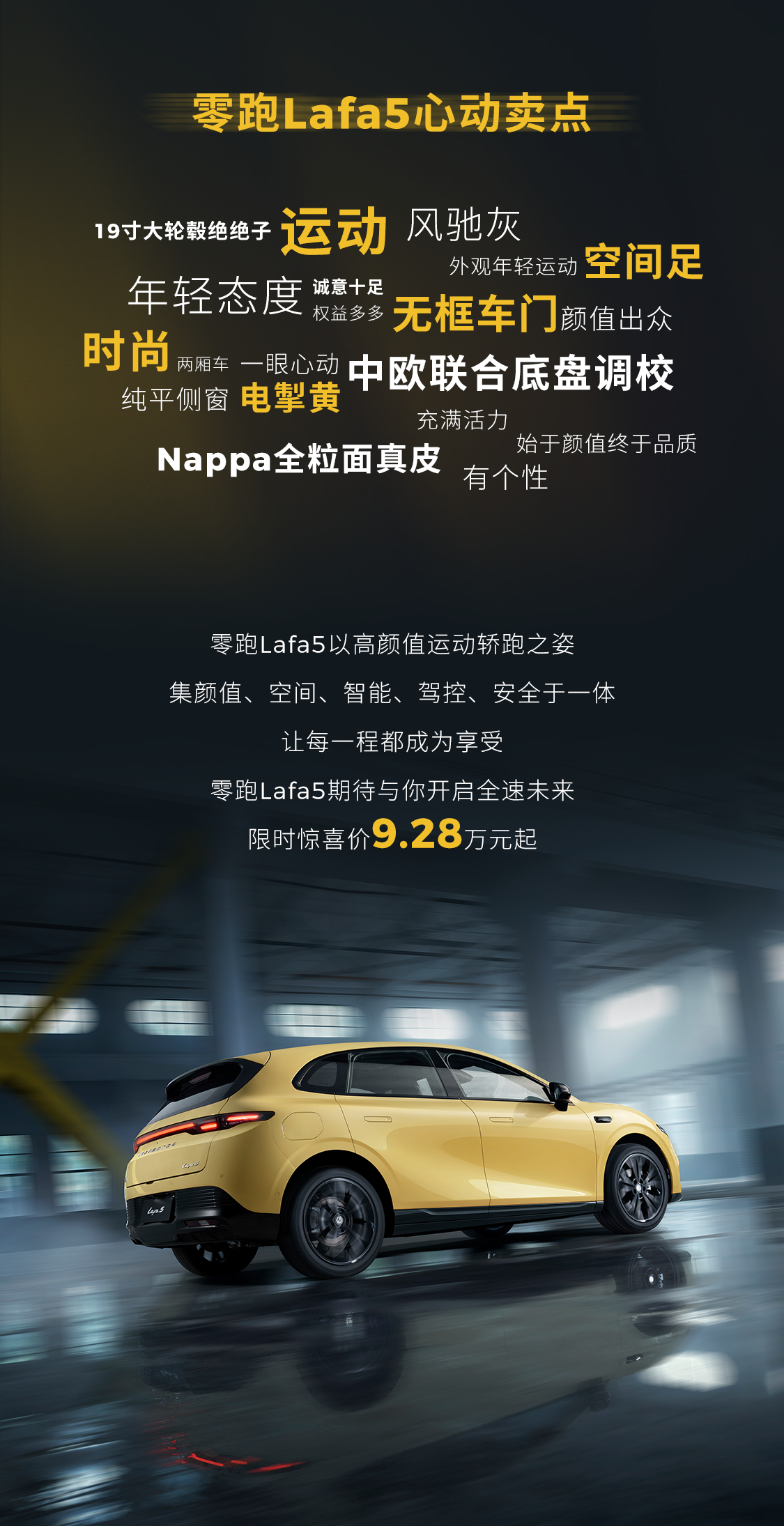 零跑Lafa5上市一周订单持续攀升首周下定用户图鉴大公开!选择605续航版本占比58%Lafa专属色风驰灰,电掣黄选购人数占比77%……与Lafa5双向奔赴的TA们,是一群怎样的年轻人?TA们在选车时,更注重哪些配置与亮点?点击图片一起看看吧!零跑Lafa5年轻人首选Lafa5限时9.28万起