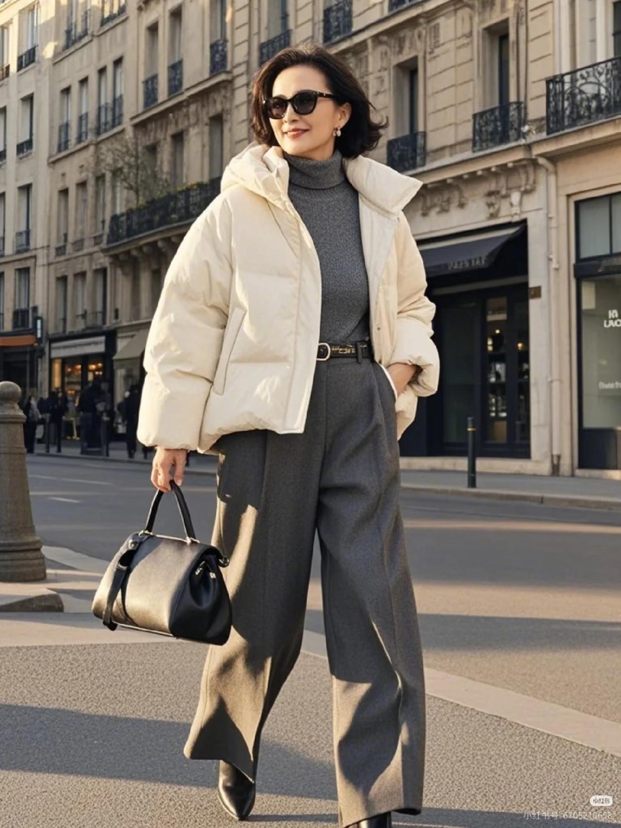 四五十岁女性冬季穿短款羽绒服+裤子,只要掌握这三点,轻松穿出保暖时髦又显高造型。 首先,选对适合的短羽绒服 要想把短羽绒服+裤子穿得好看,选对适合自己的款式才是关键。选择H版型合体款,遮肉显瘦不臃肿,适合大部分身材。避免选择蓬松版型的面包服,让上半身看起来显壮。 长度上,选择臀部以上胯骨以下的长度,能遮掩腰腹部多余赘肉,又抬高腰线。避免选择胯骨以上的超短款,不适合四五十岁这个年龄。长度盖过臀部的款式,稍长了些,也不太适合,穿在身上没有利落感。 其次,选对适合的裤子款式 每个人身材都长得不一样,建议选择适合的款式,能穿出事半功倍的效果。对于身材不完美的朋友,建议选择高腰直筒裤、阔腿裤、西装裤等,可以遮掩腿部缺陷,让双腿看起来笔直修长,上下身比例更均衡。 对于身材匀称又个性时尚的朋友,还可以选择短羽绒服和加绒瑜伽裤组合。内搭一件稍微长点的连帽卫衣,衣摆盖过臀部,露出细长的双腿,脚上穿一双运动鞋,套上长筒袜增加层次感,时髦显腿长。 最后,颜色搭配避免沉闷 在选择颜色搭配时,如果羽绒服颜色浅,裤子可以选深色或牛仔裤搭配。要是羽绒服颜色偏深,可以选择浅色内搭提亮肤色,或搭配浅色裤子,打破沉闷,穿出层次分明又显年轻造型。 避免羽绒服和裤子以及内搭都选择深色搭配,容易显沉闷老气。在选择内搭时,避免款式过于宽松,会显臃肿。建议选择合体的款式,并把衣摆扎进裤腰里,凸显出高腰线,造型好看显身高。
