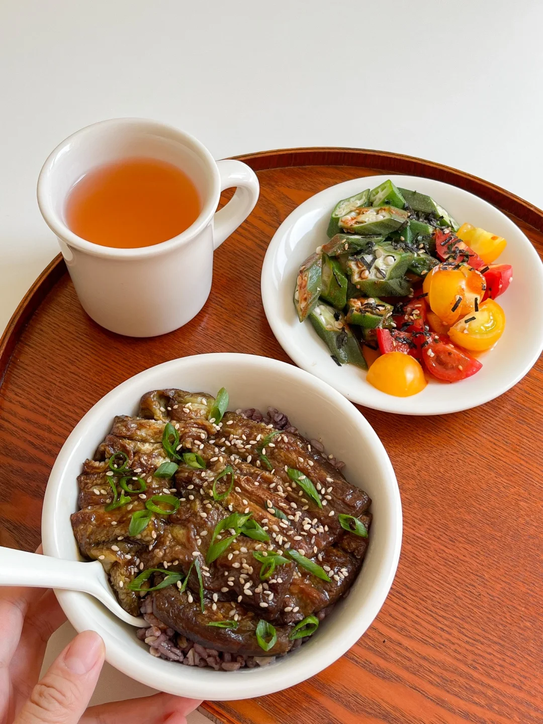 “食物越少加工,膳食纤维含量越高,GI越低。生的菜,完整的水果,全谷类,是better choice!” 今日午餐: ¹低卡照烧茄子饭 ²凉拌秋葵小番茄 ³西柚汁