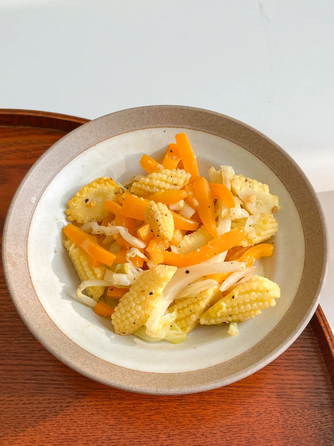 之前买的橙色彩椒和玉米笋拼成一个炒蔬菜