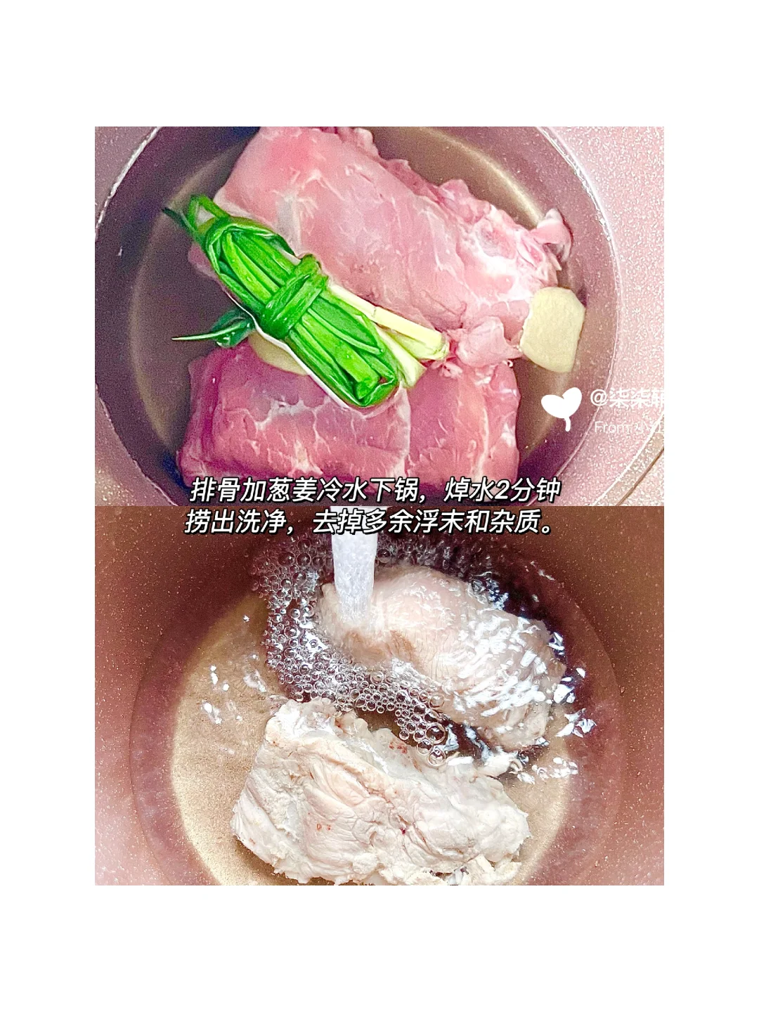 ▫️排骨冷水下锅加葱姜焯水去腥,煮开撇去浮末,捞出把浮末清洗干净。