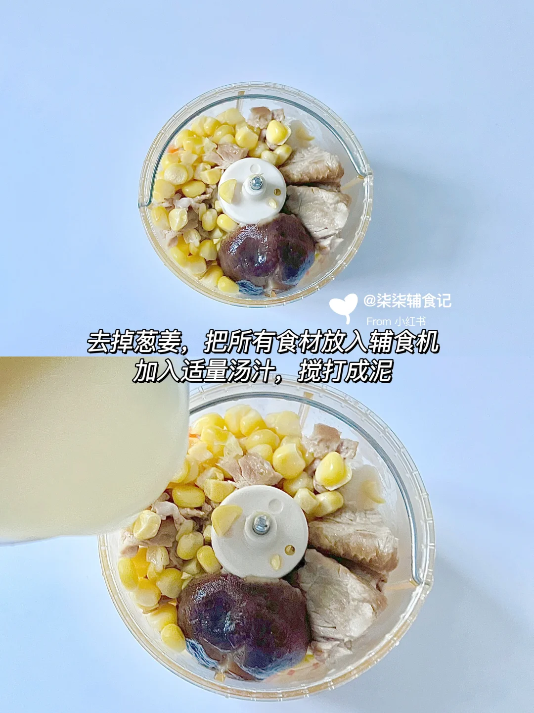 ▫️煮熟把葱姜捞出,其余食材放入辅食机,加入适量汤汁,搅打成泥。