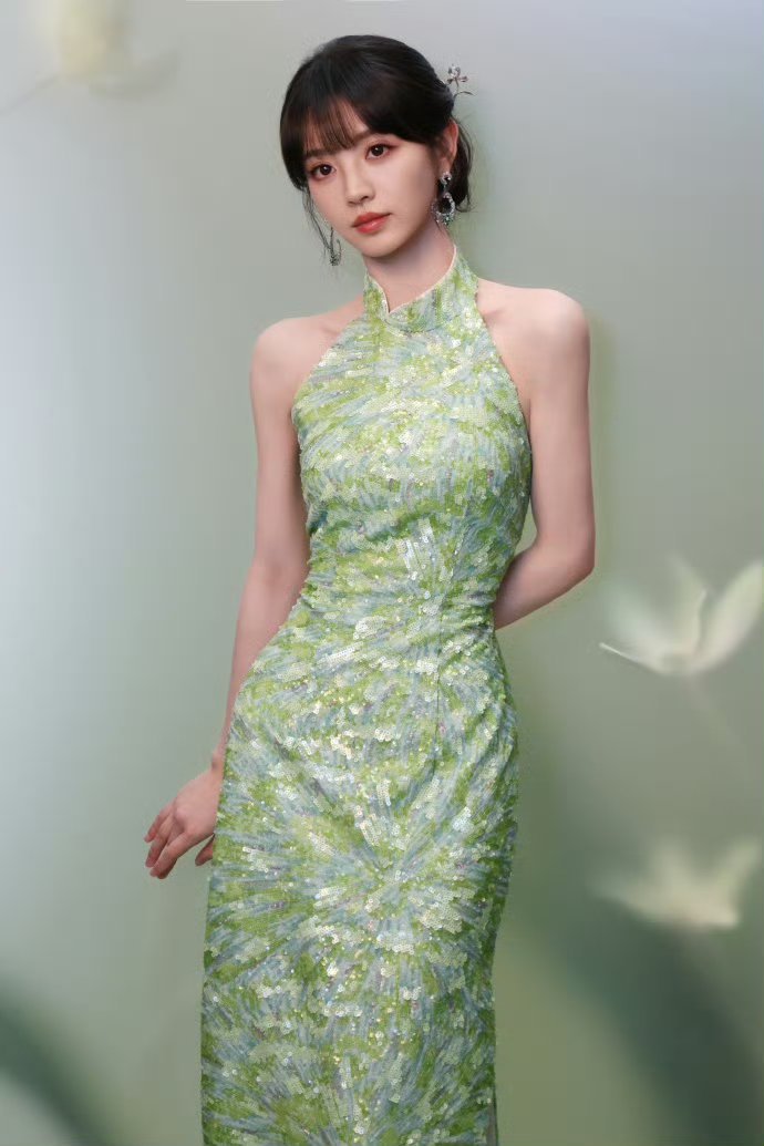 田曦薇绿色挂脖旗袍田曦薇 感觉适配更多风格,拥有更多无限可能