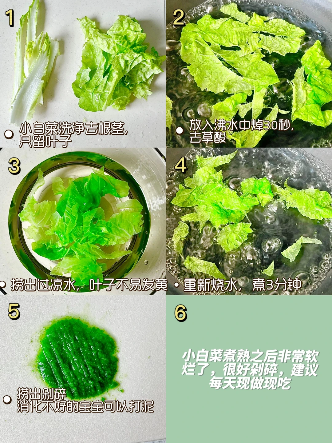 2️⃣水开放入小白菜叶,焯水30秒,去草酸