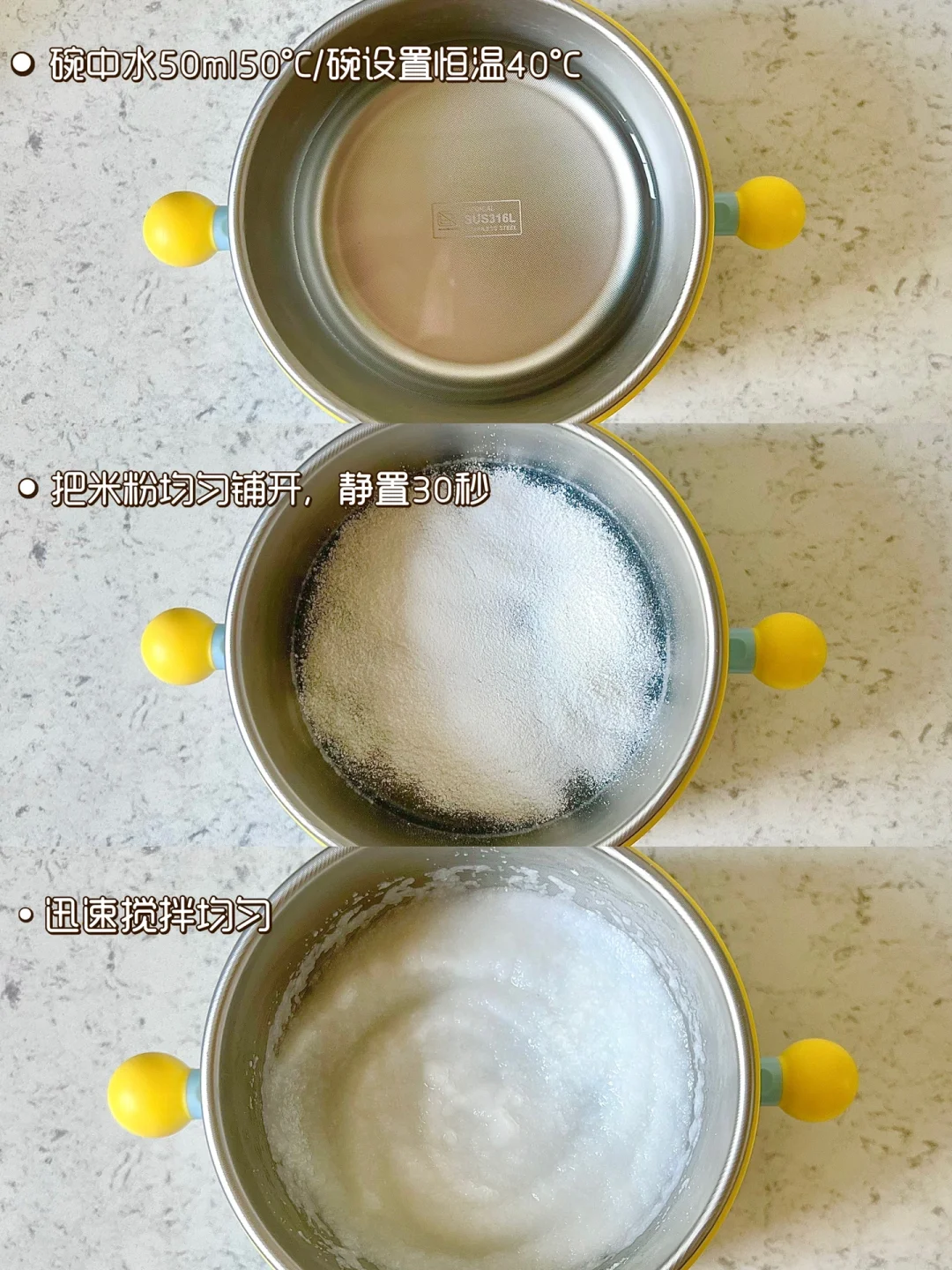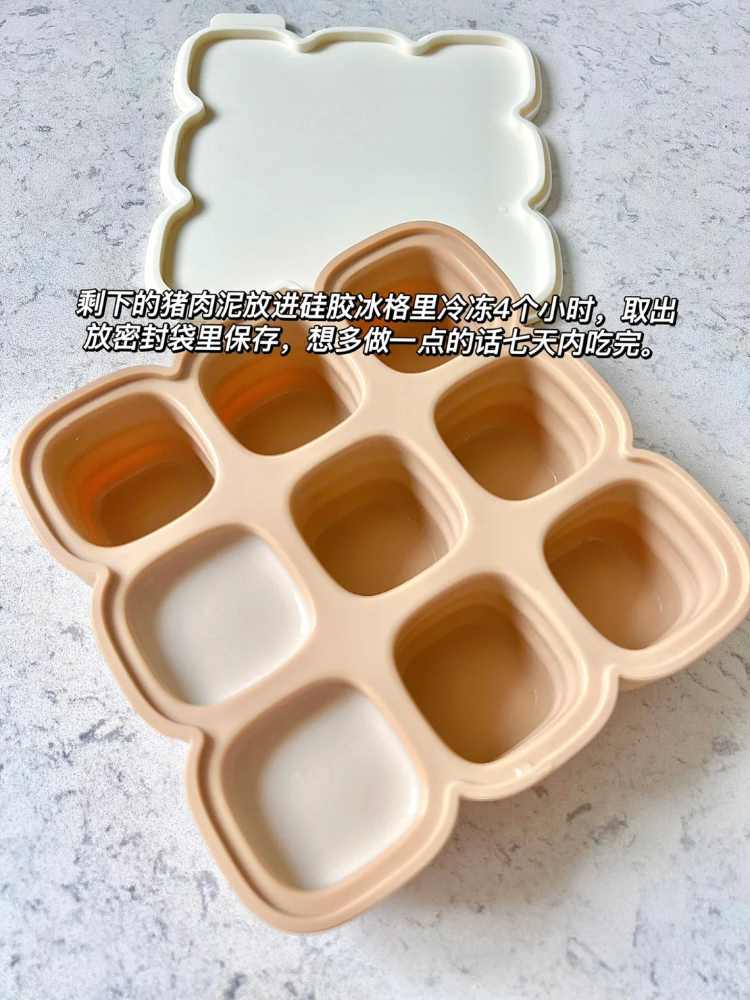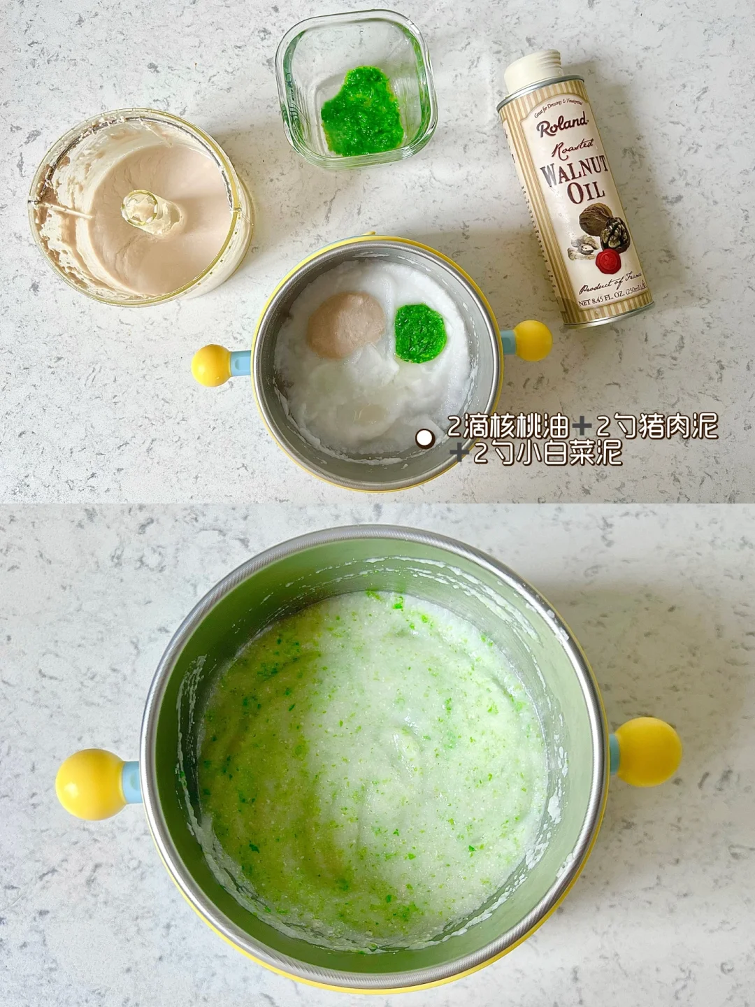 📝:5g米粉➕50ml水,2滴核桃油➕2勺猪肉泥➕2勺小白菜泥
