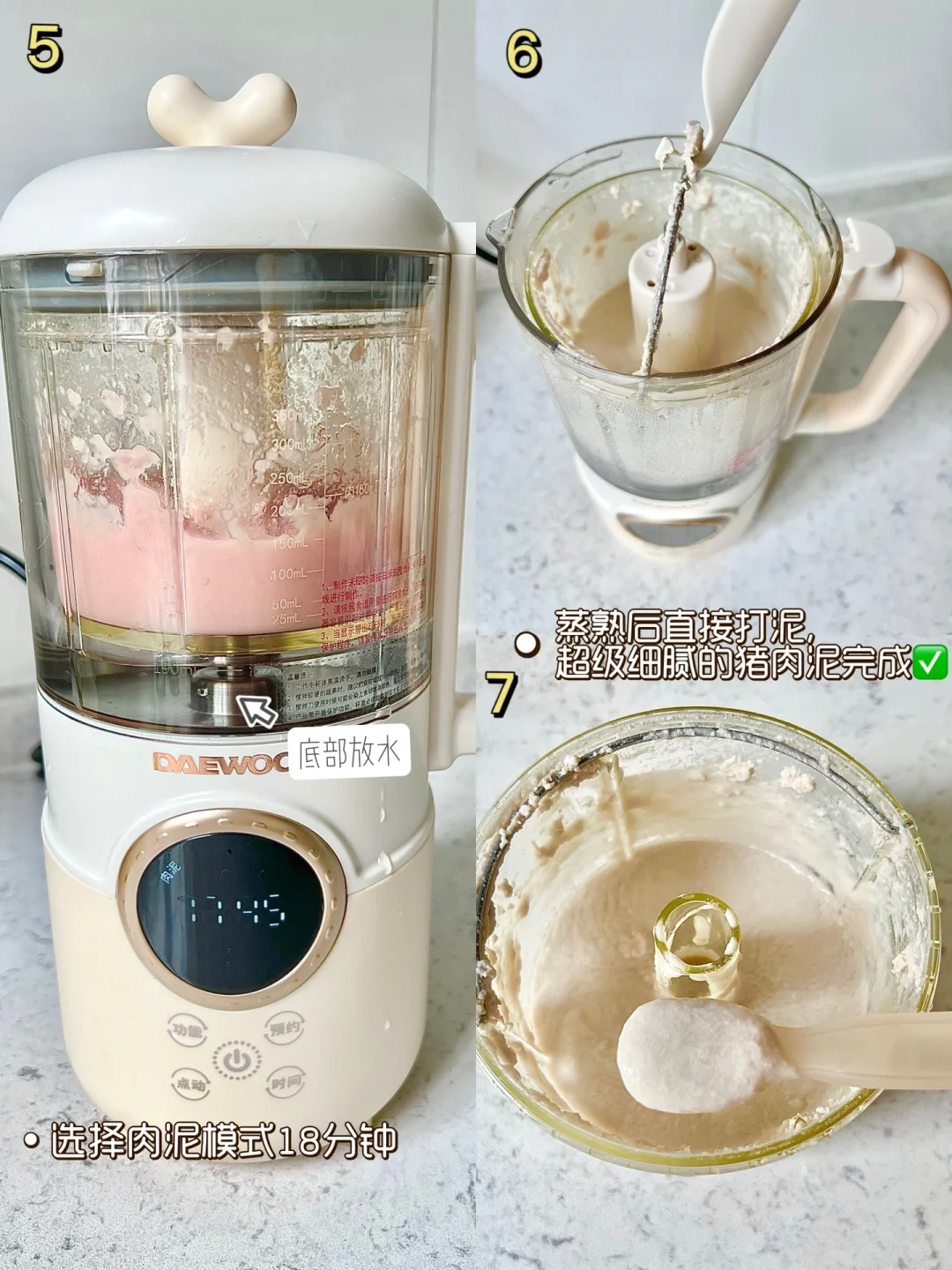 4️⃣选择肉泥模式,先蒸煮后搅打,18分钟就完成细腻的猪肉泥啦!