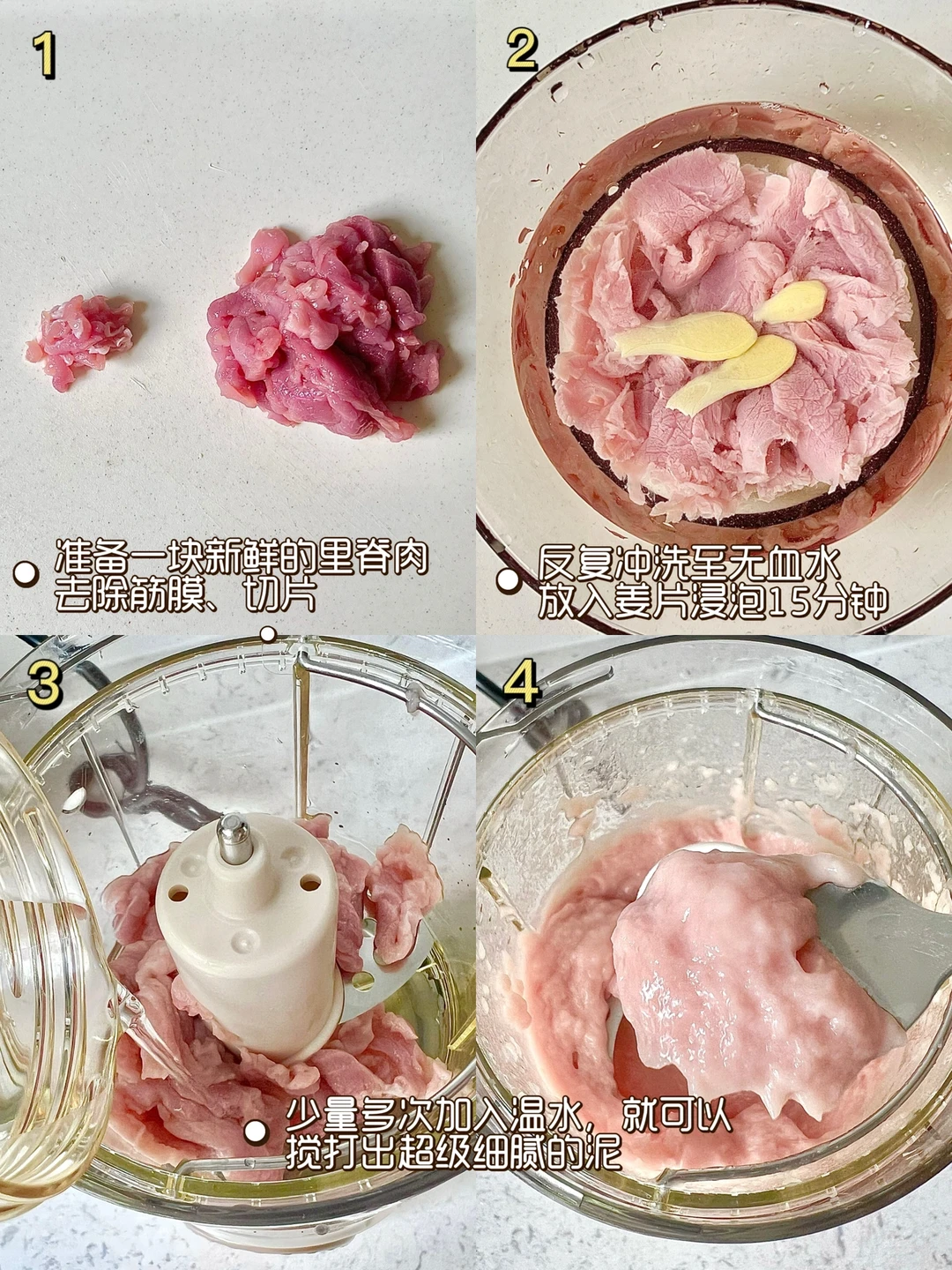 3️⃣清洗干净,去掉姜片,少量多次加入温水,搅打成生肉泥(点动模式)
