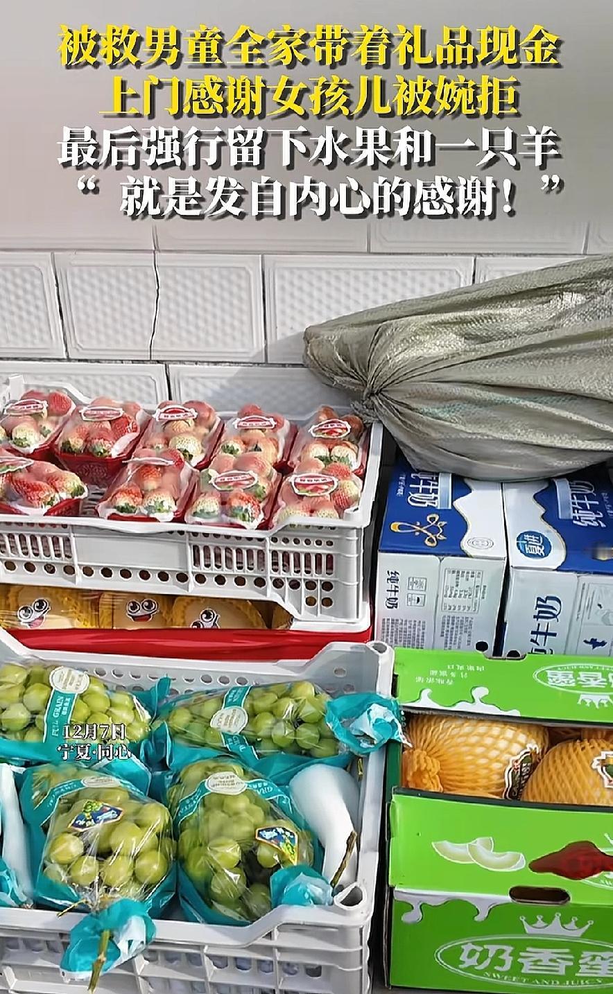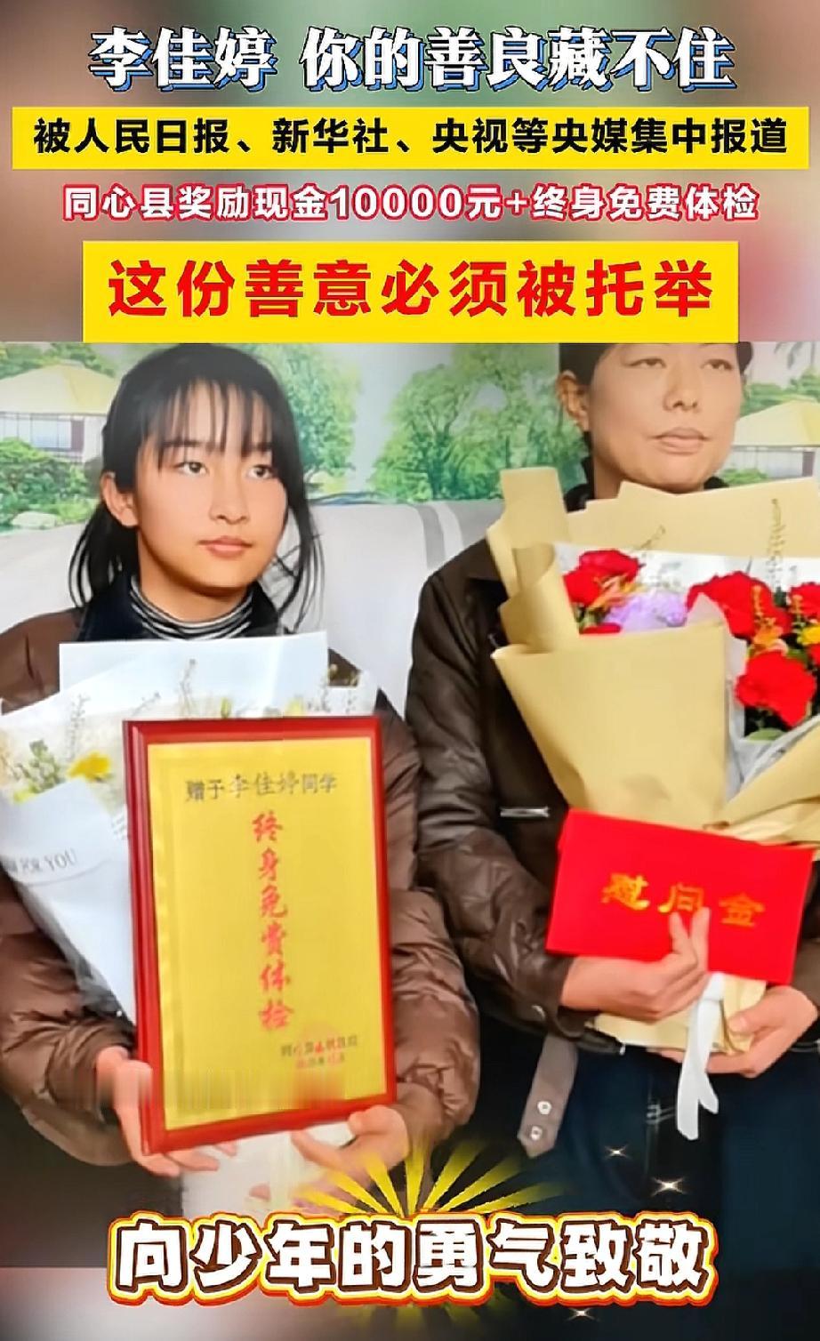 宁夏13岁女孩李佳婷,救人不留名,事后不炫耀,这是刻在骨子里的善良。 当然,她的善意也没被辜负,被救男童全家带着现金和礼品上门感谢,李佳婷的家长婉拒了谢礼,但男童的家人还是强行留下水果和一只宰好的羊羔表达心意。 校长和老师登门慰问,不仅要给她开全校表彰大会,还要给她申请“见义勇为”的称号。 当地县政府领导亲自上门送奖(1万元奖金+同心县人民医院的终身免费体检)。 阿里公益联合宁夏观察融媒也送去了荣誉证书和5000元慰问金。 另外,人民日报、新华社、央视等官媒,也发文点名表扬。 一个13岁的小女孩,能在寒冷的冬季,不顾自身安危舍己救人,这样勇敢、善良的品质,即使给她再多的嘉奖也不为过,善意就该被托举。 这份对善意的呵护,也是在向社会传递一个信号:善行不会被埋没,好人就该有好报。 这将会鼓励更多的人,在关键时刻愿意伸出援助之手。 为李佳婷点赞,也为每一个善良的人点赞!