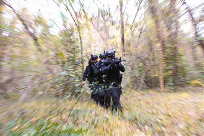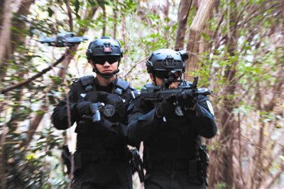 演练现场直面真实野外挑战,在丛林与山地构成的复杂地形中,特警队员全副武装,借助无人机与搜救犬的精准配合,迅速锁定“目标”并完成处置。