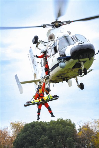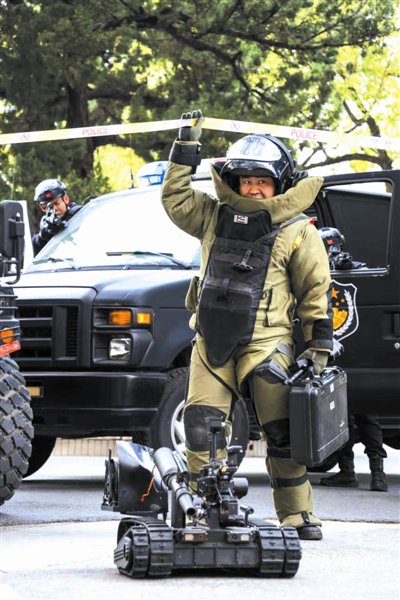 空中,警用直升机轰鸣盘旋,展开巡逻搜救与“空地一体”协同演练;地面,身着30斤重防护服的排爆手,正冷静操控机器人,对“爆炸物”进行毫厘之间的精细转移。