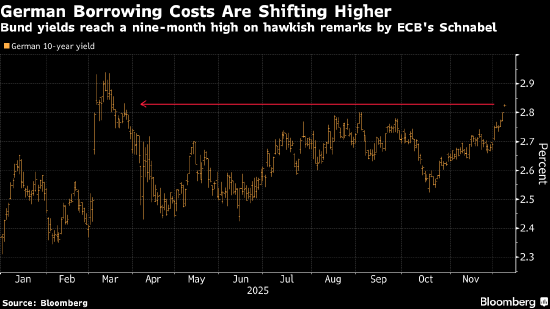 货币市场周一押注欧洲央行在2026年12月前加息25个基点的概率为25%,这是自该央行去年开始降息以来,市场对加息行动最激进的押注。10年期德国国债收益率涨5个基点至2.85%,为3月以来最高。