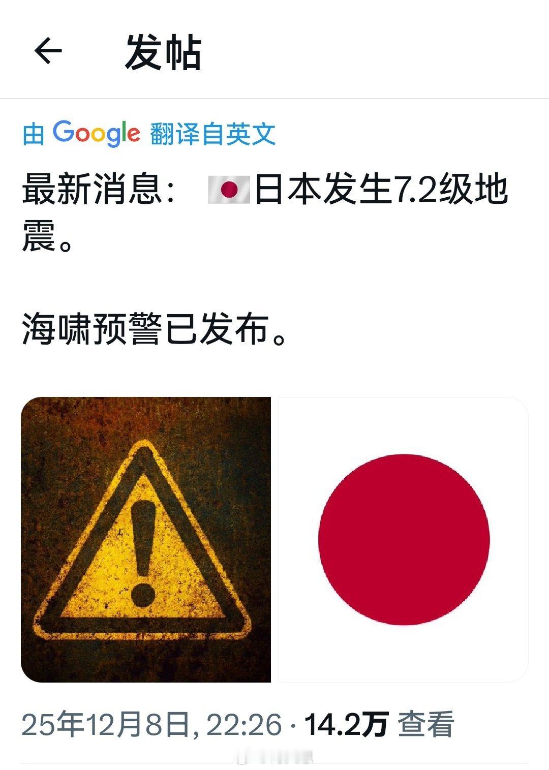 日本地震 北海道、青森和岩手三地的太平洋沿岸地区发布了海啸警报。海啸波正在逼近,预计高度可达 3 米。警报称:如果您身处北海道、青森或岩手的太平洋沿岸地区,请立即撤离。日本近海7.5级强震何天恩