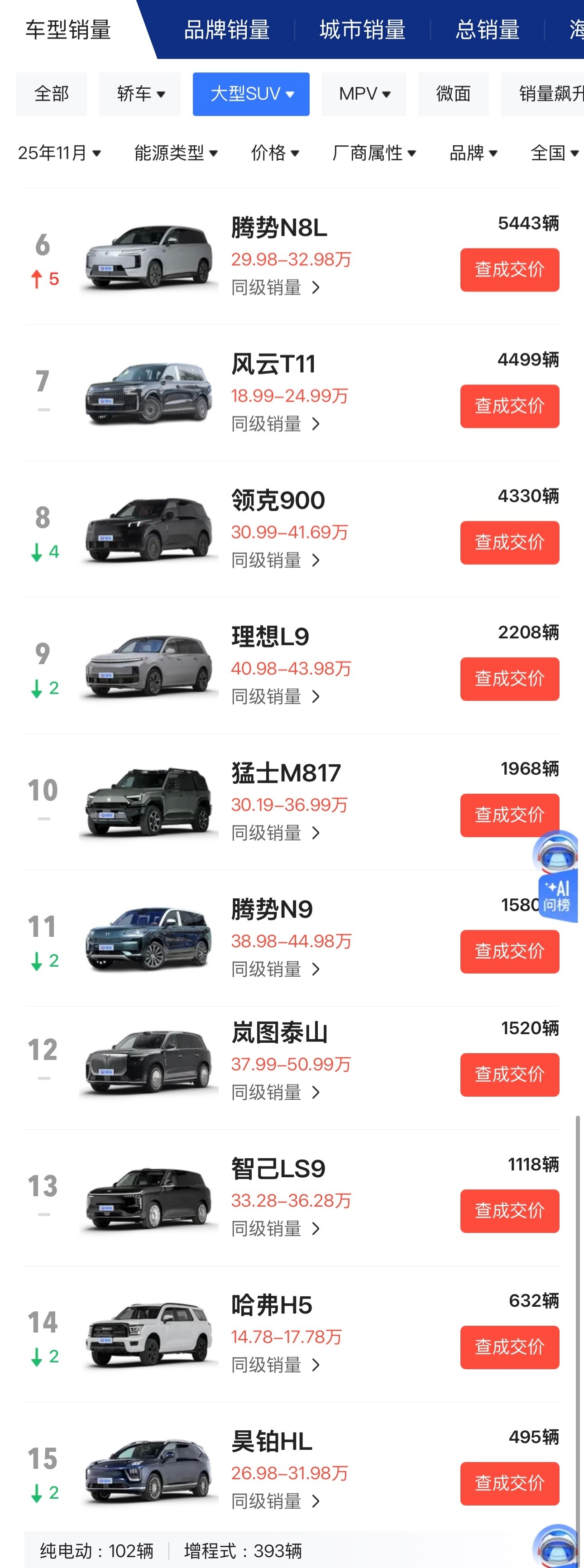 今天易车上线了最新销量(到2025年11月),这个估计是乘联会的数据。看了看目前热门的5米2大SUV这个细分市场,问界M8依旧坚挺、换代的蔚来ES8也非常强势,他俩都突破了1万。不过,令我没想到的是,极氪9X做到了第三。接下来这个细分市场的排位依旧会变化很大,我们还是持续关注吧!